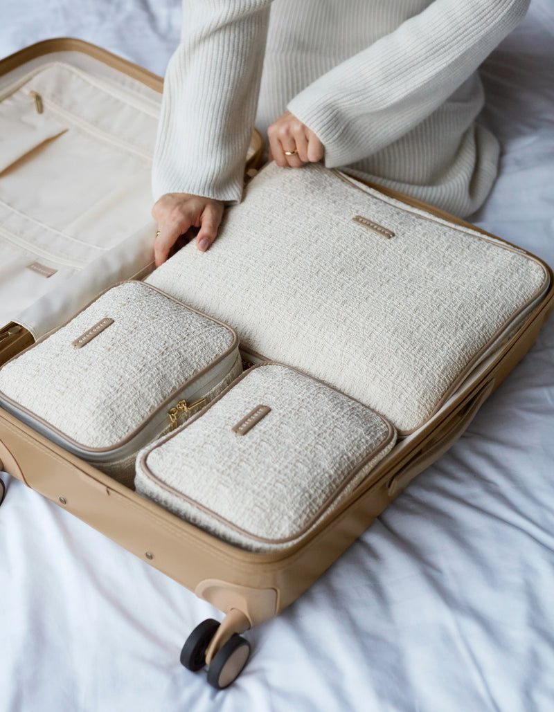 Available in two different materials: Sloppy Cotton and Raw Cotton. Designed to keep your luggage neat and efficiently packed. The packing cubes come in 3 different sizes.
