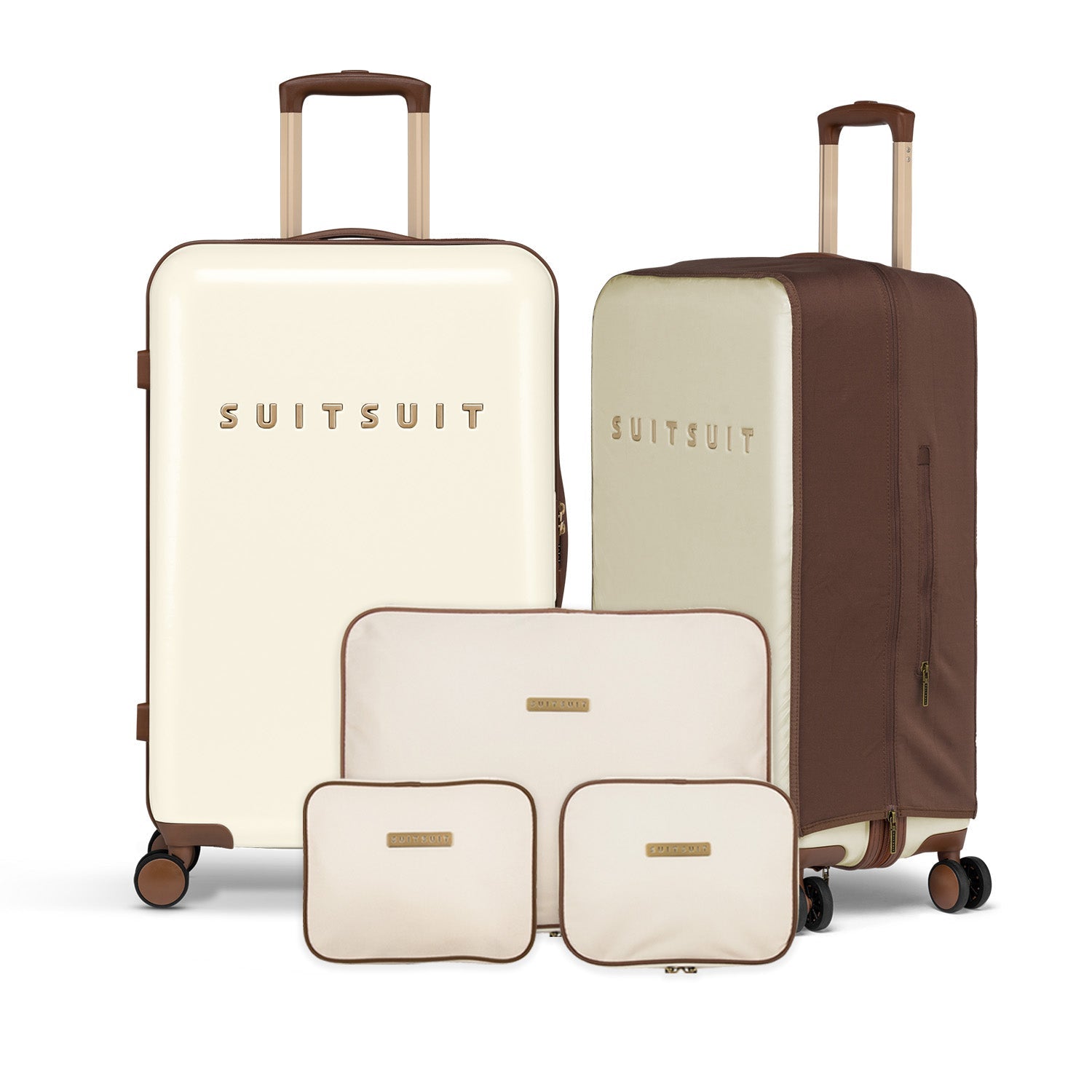 - This set includes the Antique White suitcase (66 CM), the Burned Caramel protection cover (66 CM), and the Antique White packing cube set (66 CM).
