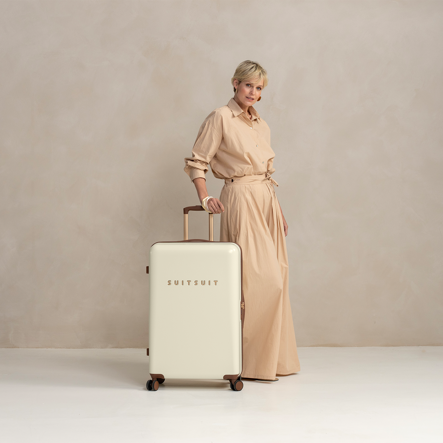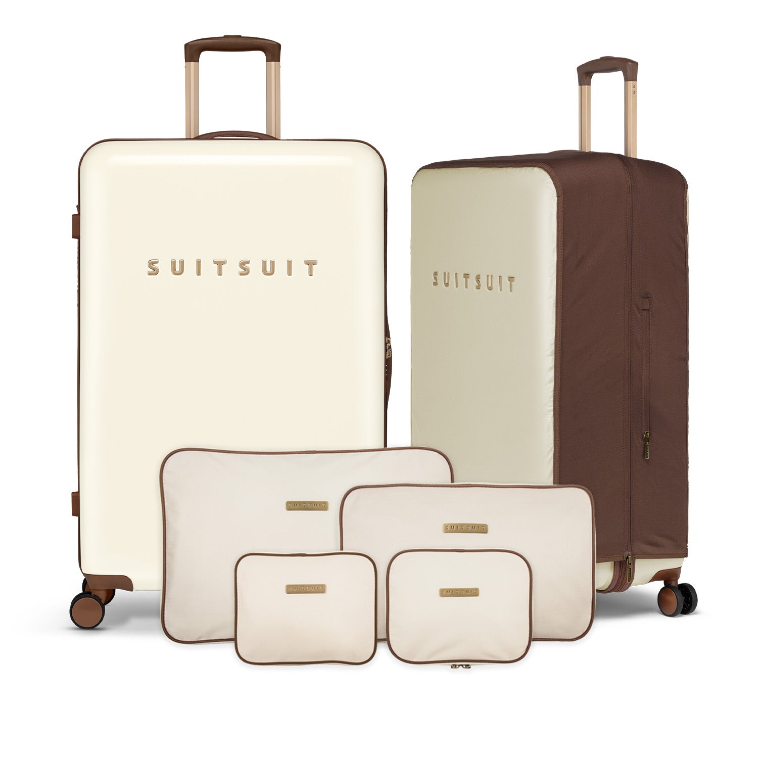 - This set includes the Antique White suitcase (76 CM), the Burned Caramel protection cover (76 CM), and the Antique White packing cube set (76 CM).
