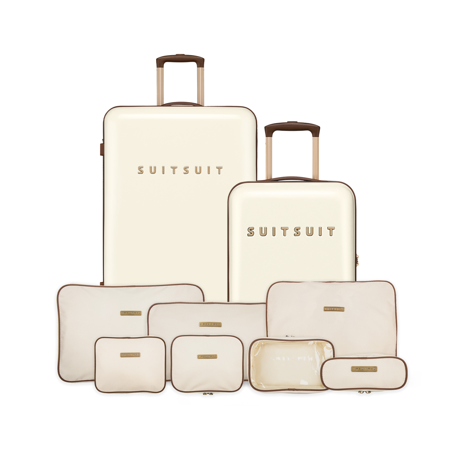 - This set includes the Antique White suitcase (76 CM), the Antique White carry-on suitcase (55 CM), and two Antique White packing cube sets (55 CM and 76 CM).