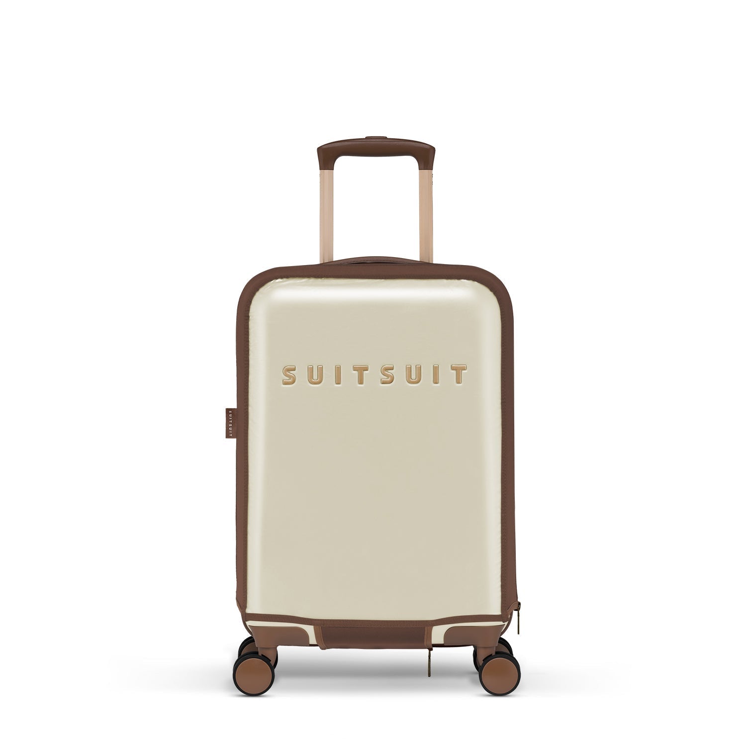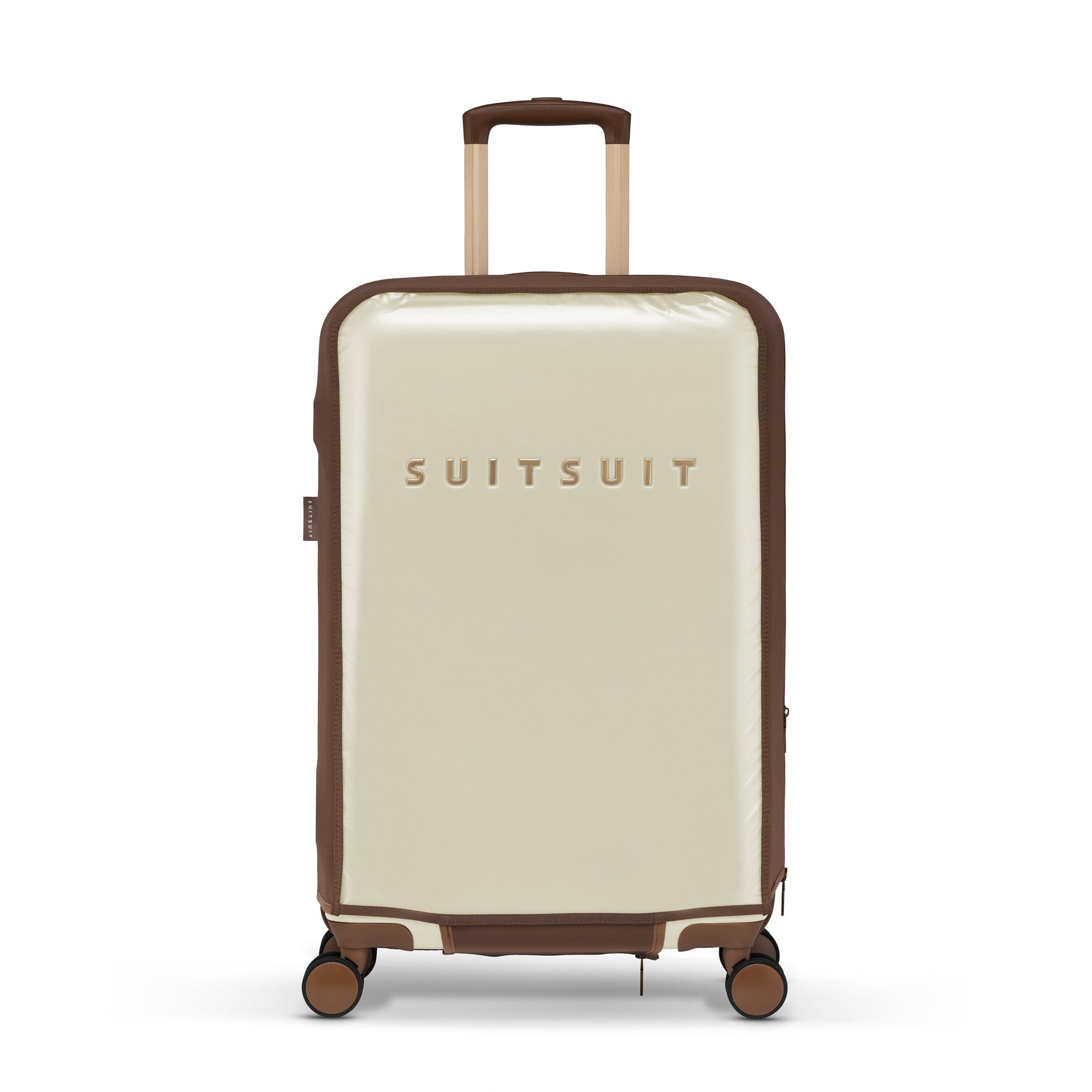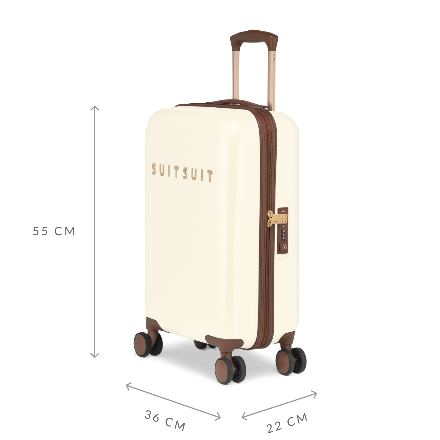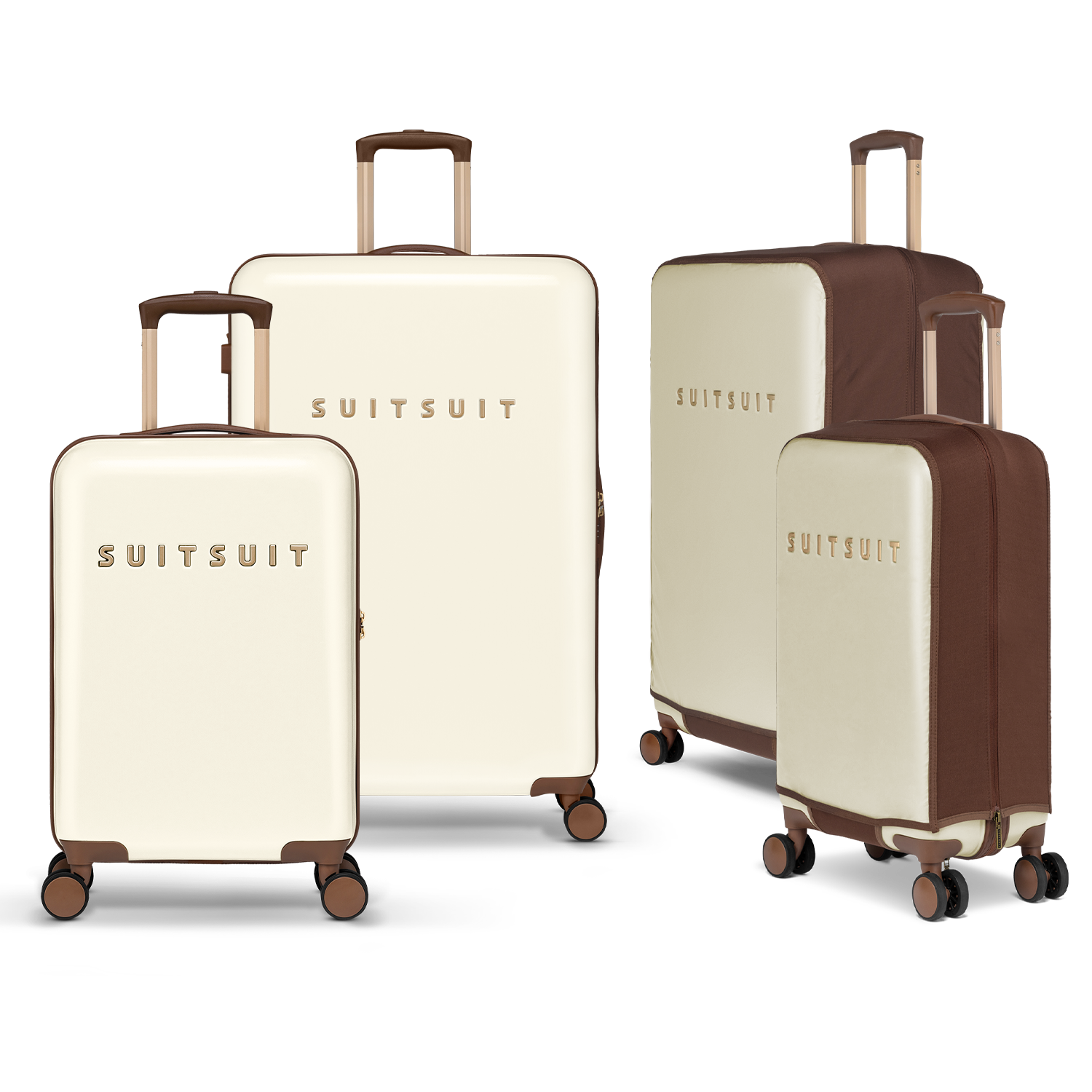 - This set includes the Antique White suitcase (76 CM), the Antique White carry-on suitcase (55 CM), and two Burned Caramel protection covers (55 CM and 76 CM).