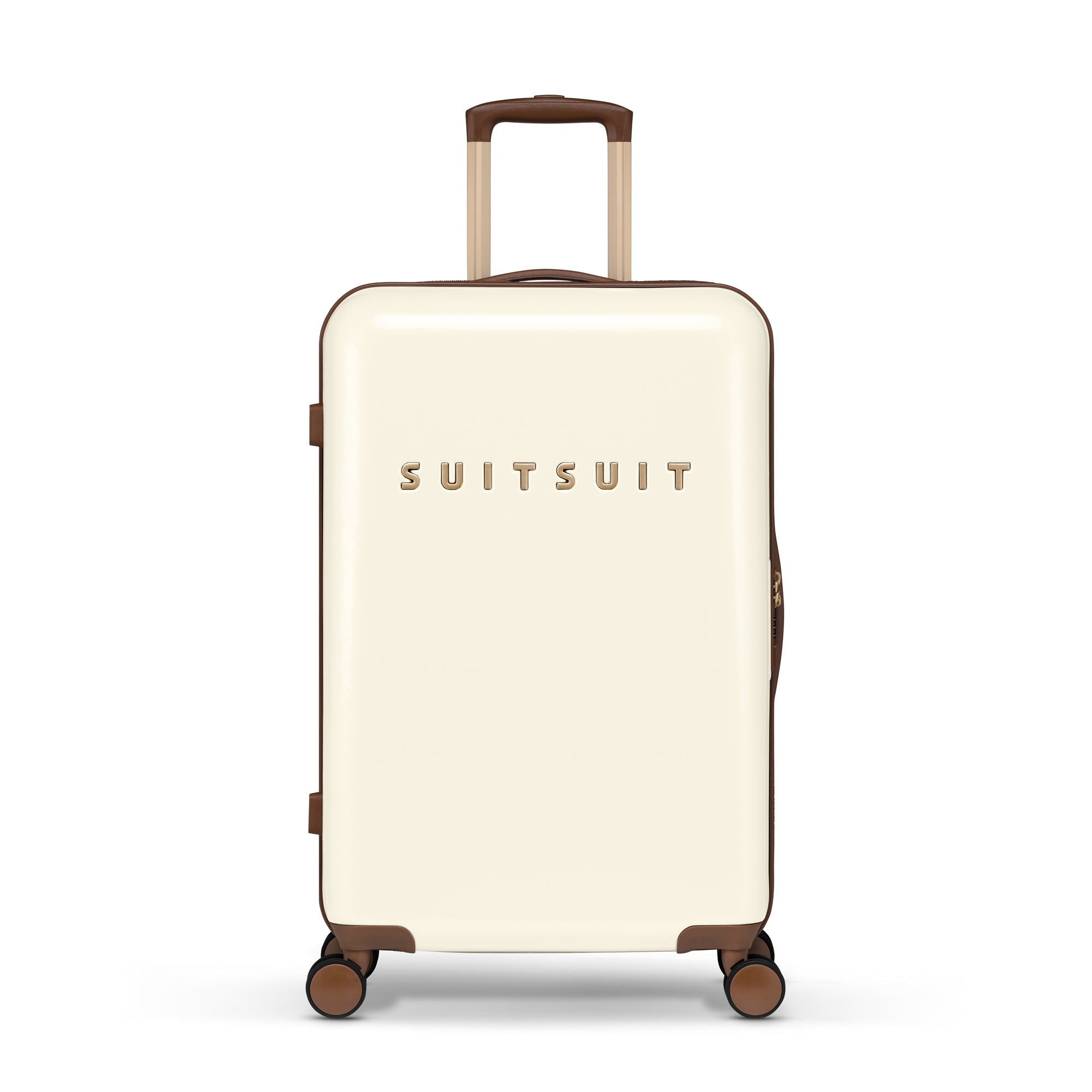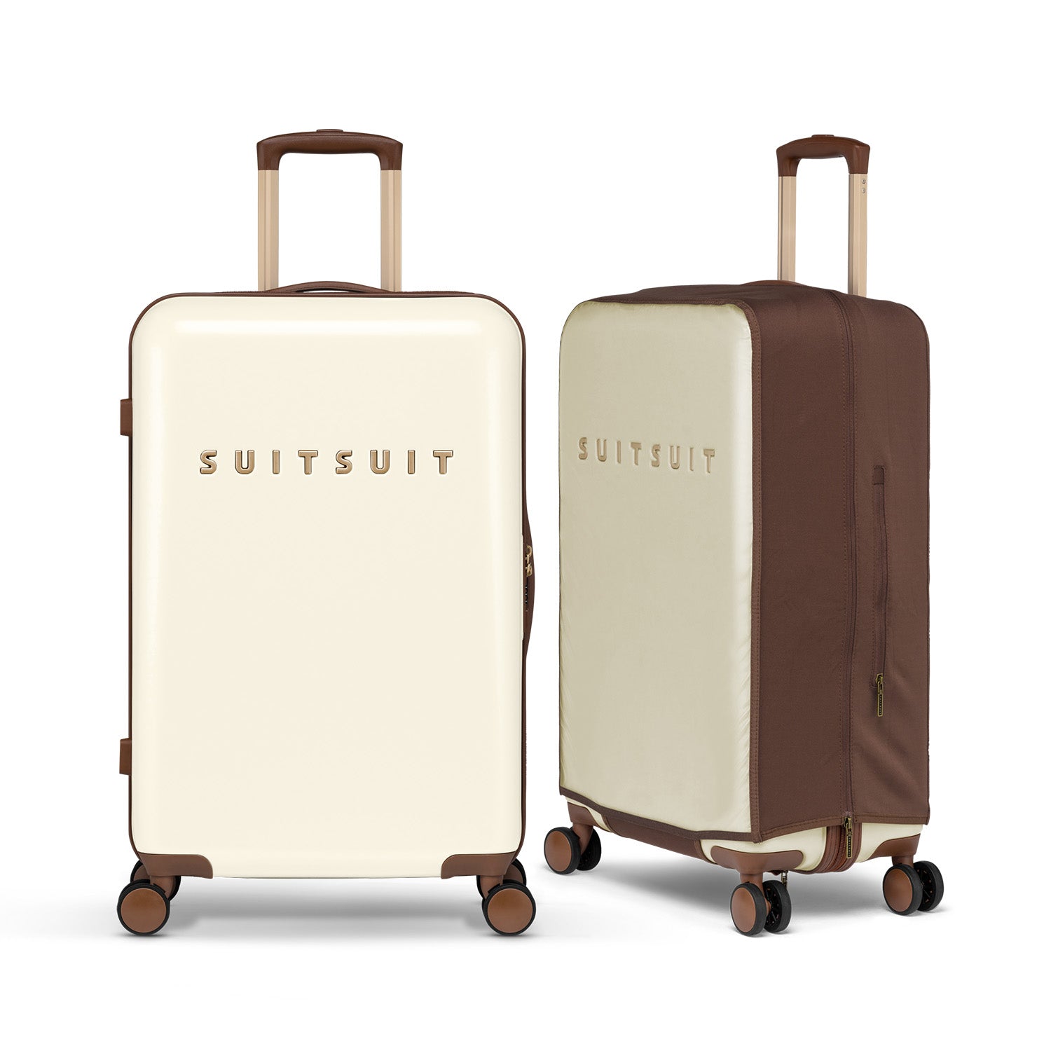 - This set includes the Antique White suitcase (66 CM) and the Burned Caramel protection cover (66 CM).