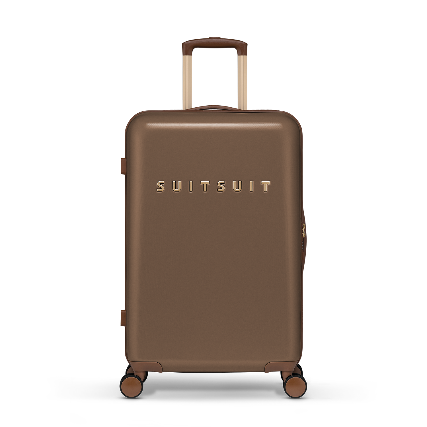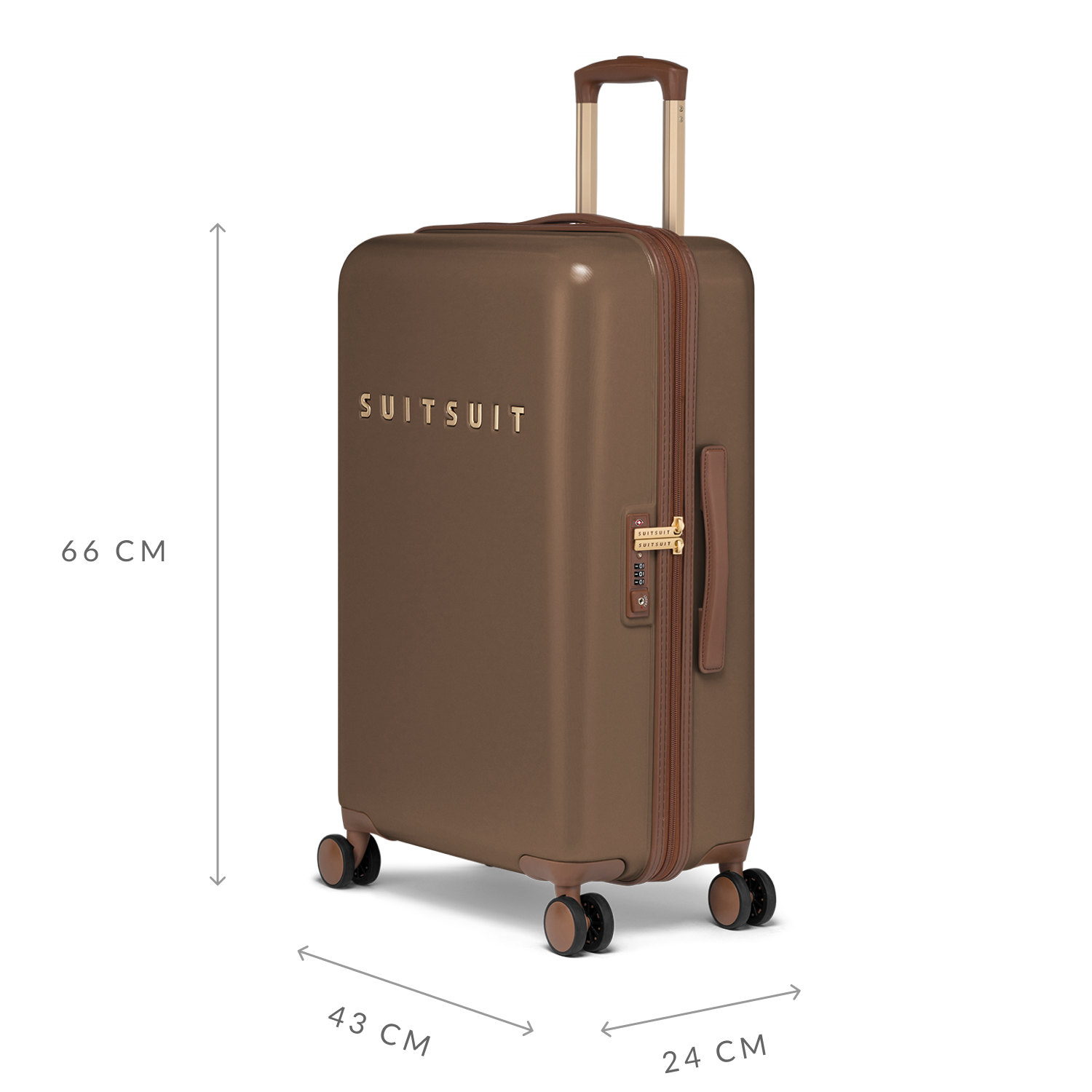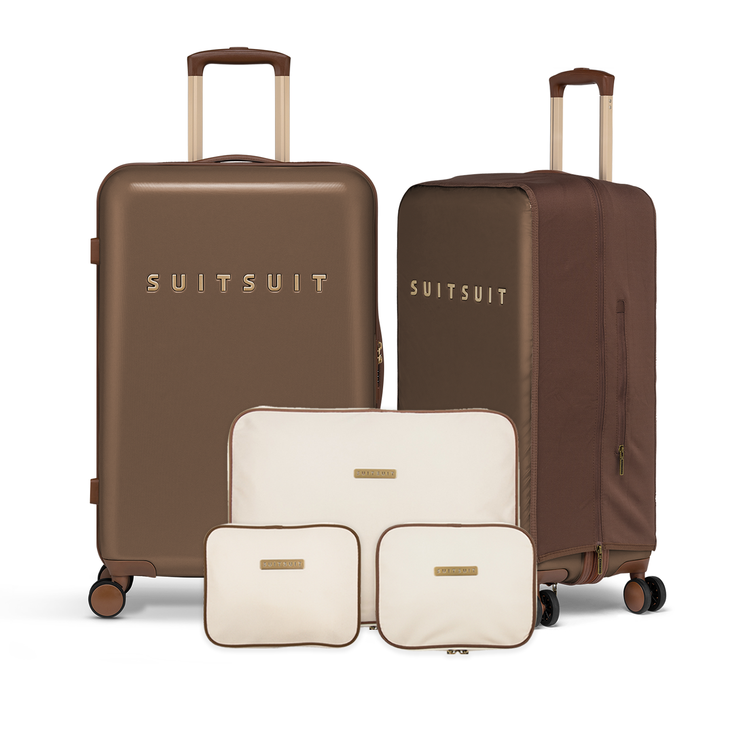 - This set includes the Cocoa Brown suitcase (66 CM), the Burned Caramel protection cover (66 CM), and the Antique White packing cube set (66 CM).