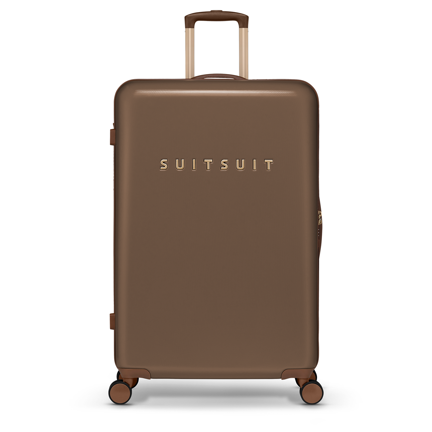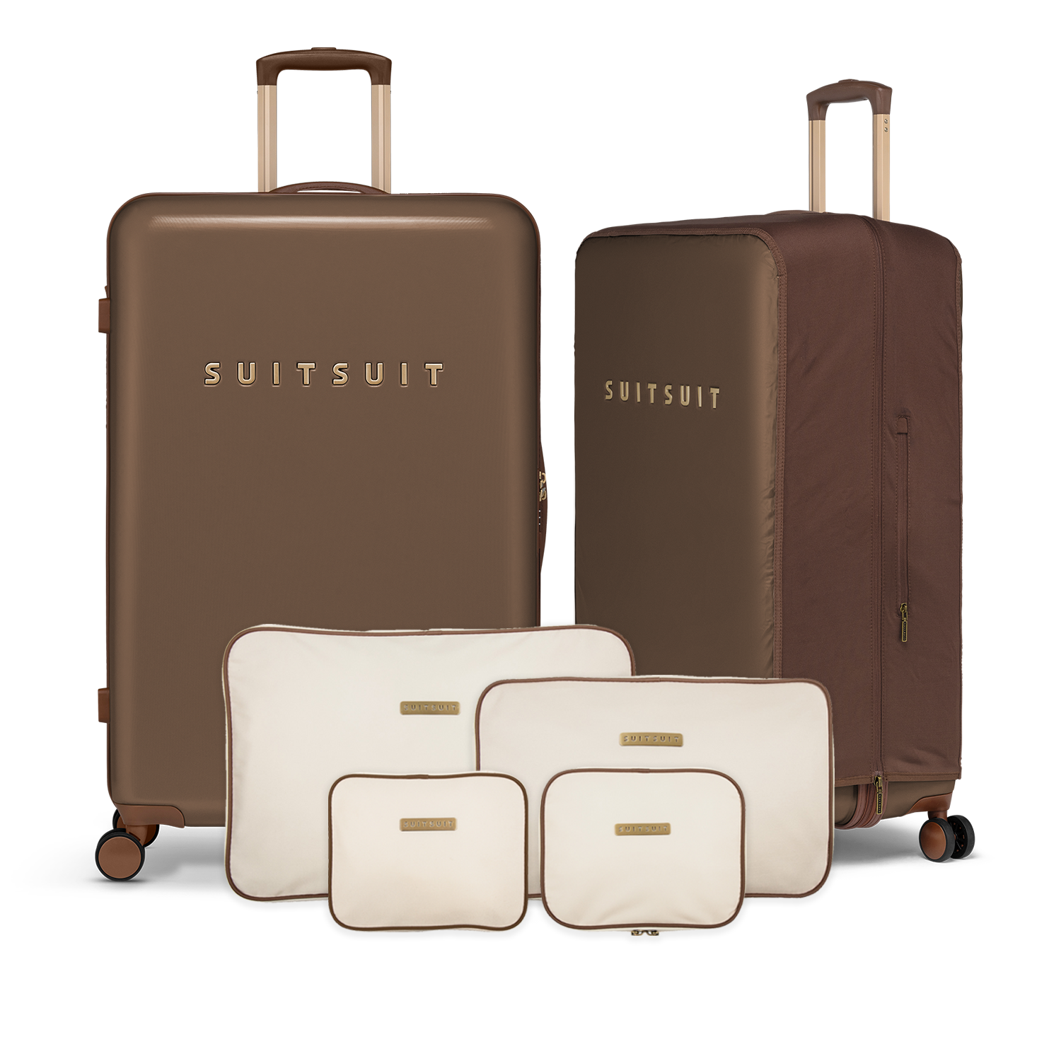 - This set includes the Cocoa Brown suitcase (76 CM), the Burned Caramel protection cover (76 CM), and the Antique White packing cube set (76 CM).