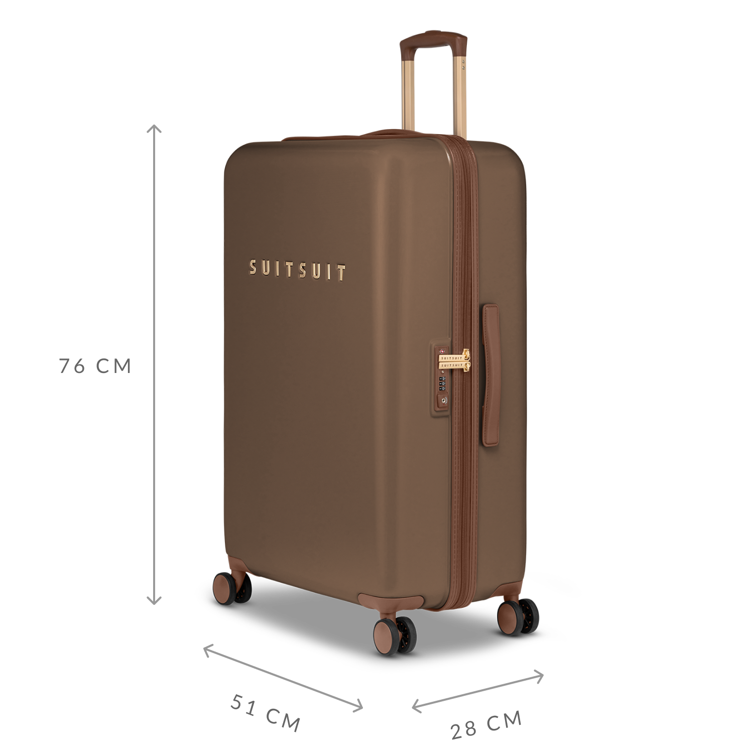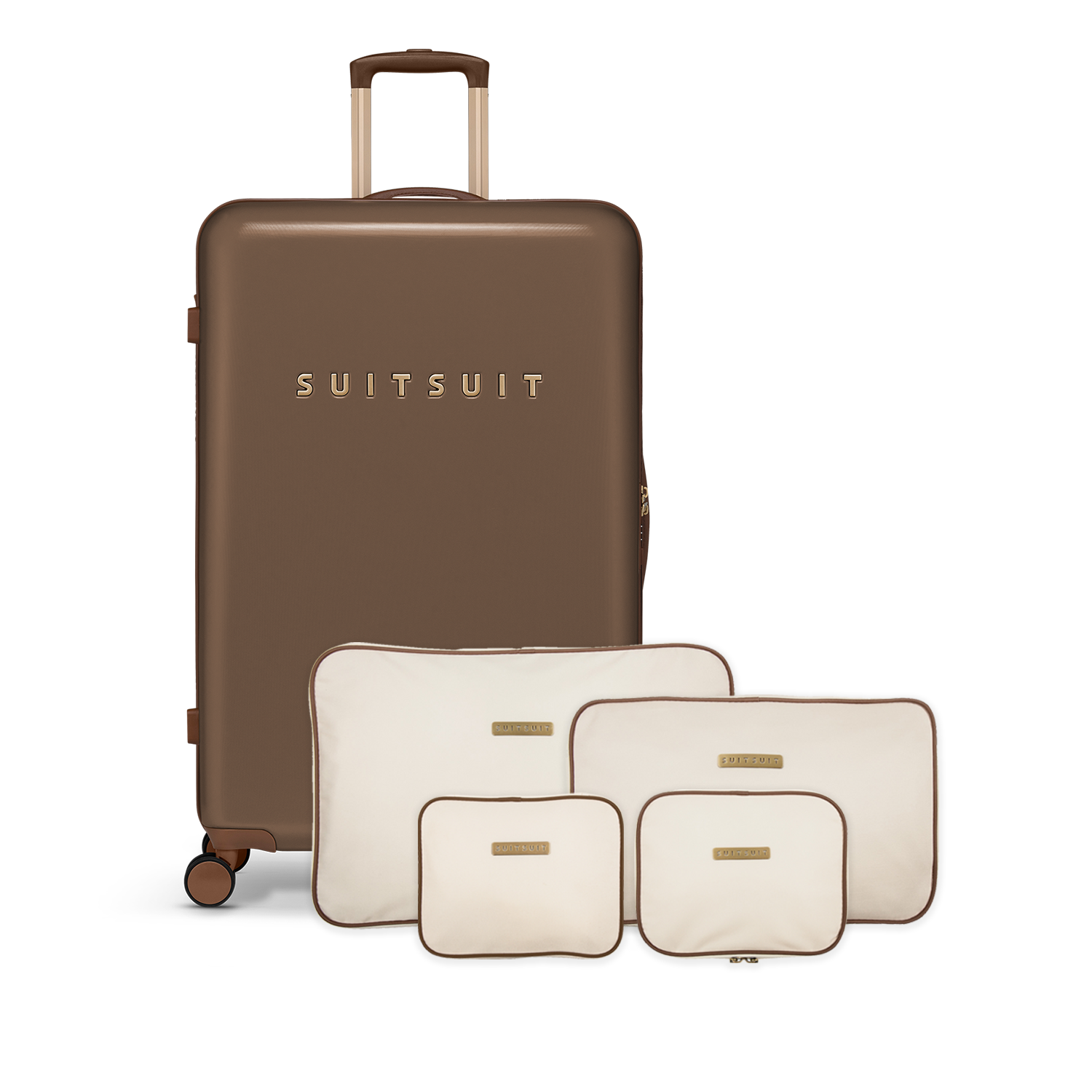 - This set includes the Cocoa Brown check-in suitcase (28-inch) and the Antique White packing cube set (28-inch).