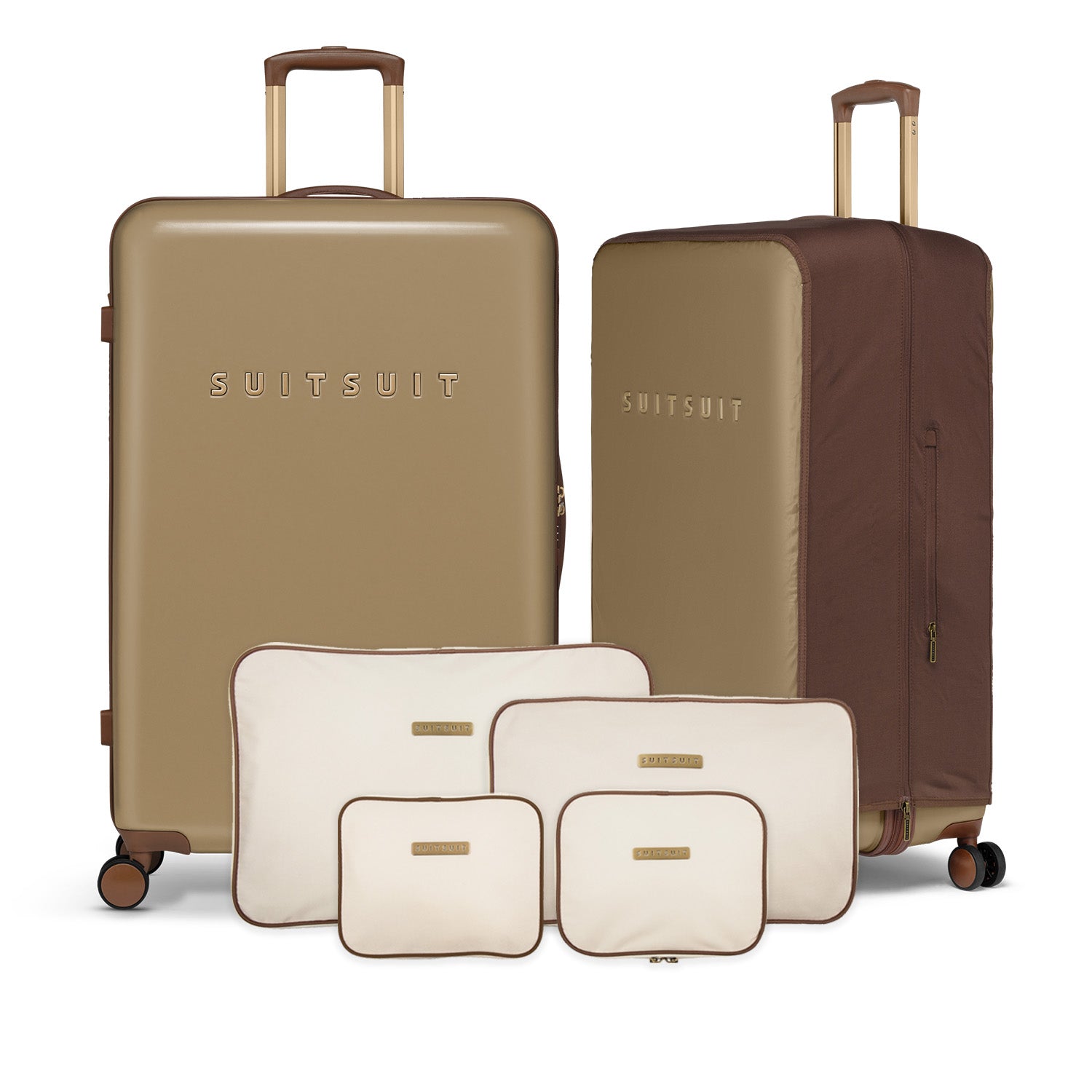 - This set includes the Cuban Sand suitcase (76 CM), the Burned Caramel protection cover (76 CM), and the Antique White packing cube set (76 CM).