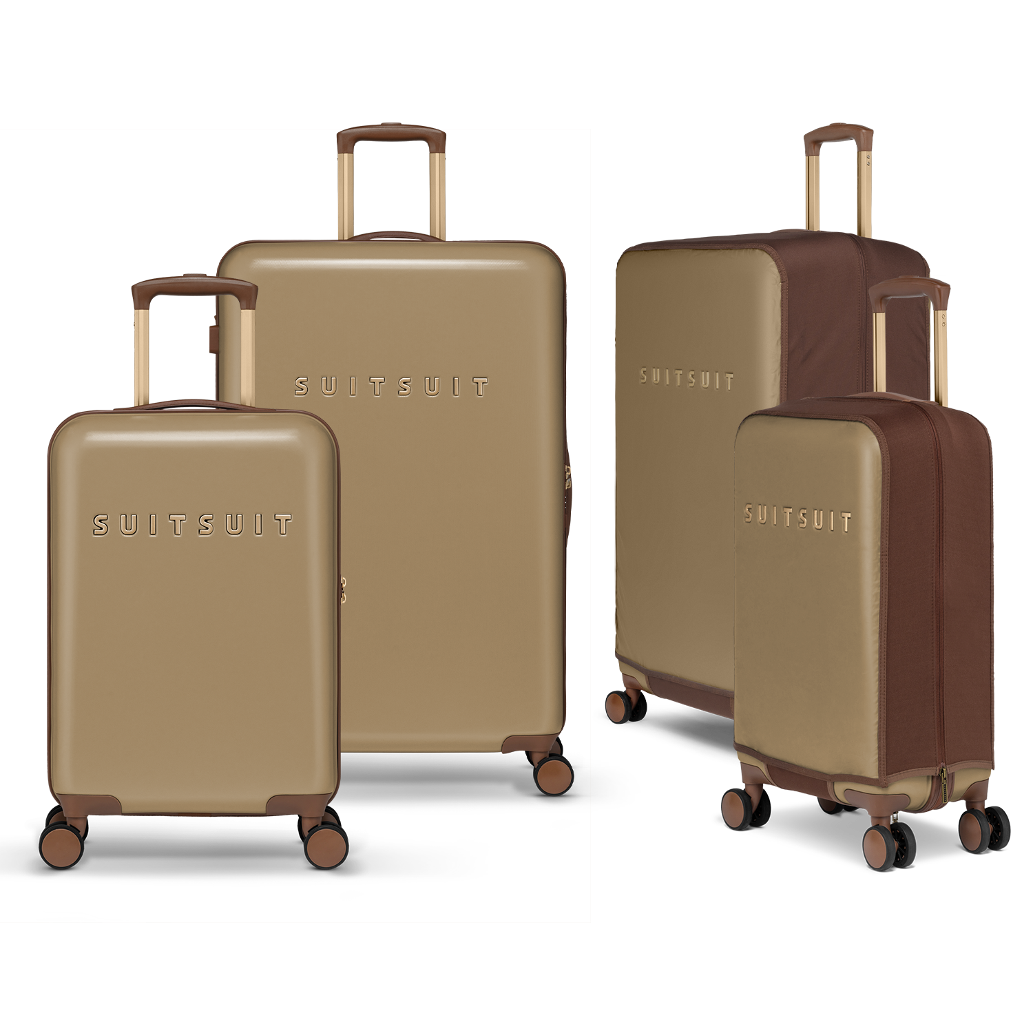 - This set includes the Cuban Sand suitcase (76 CM), the Cuban Sand carry-on suitcase (55 CM), and two Burned Caramel protection covers (55 CM and 76 CM).