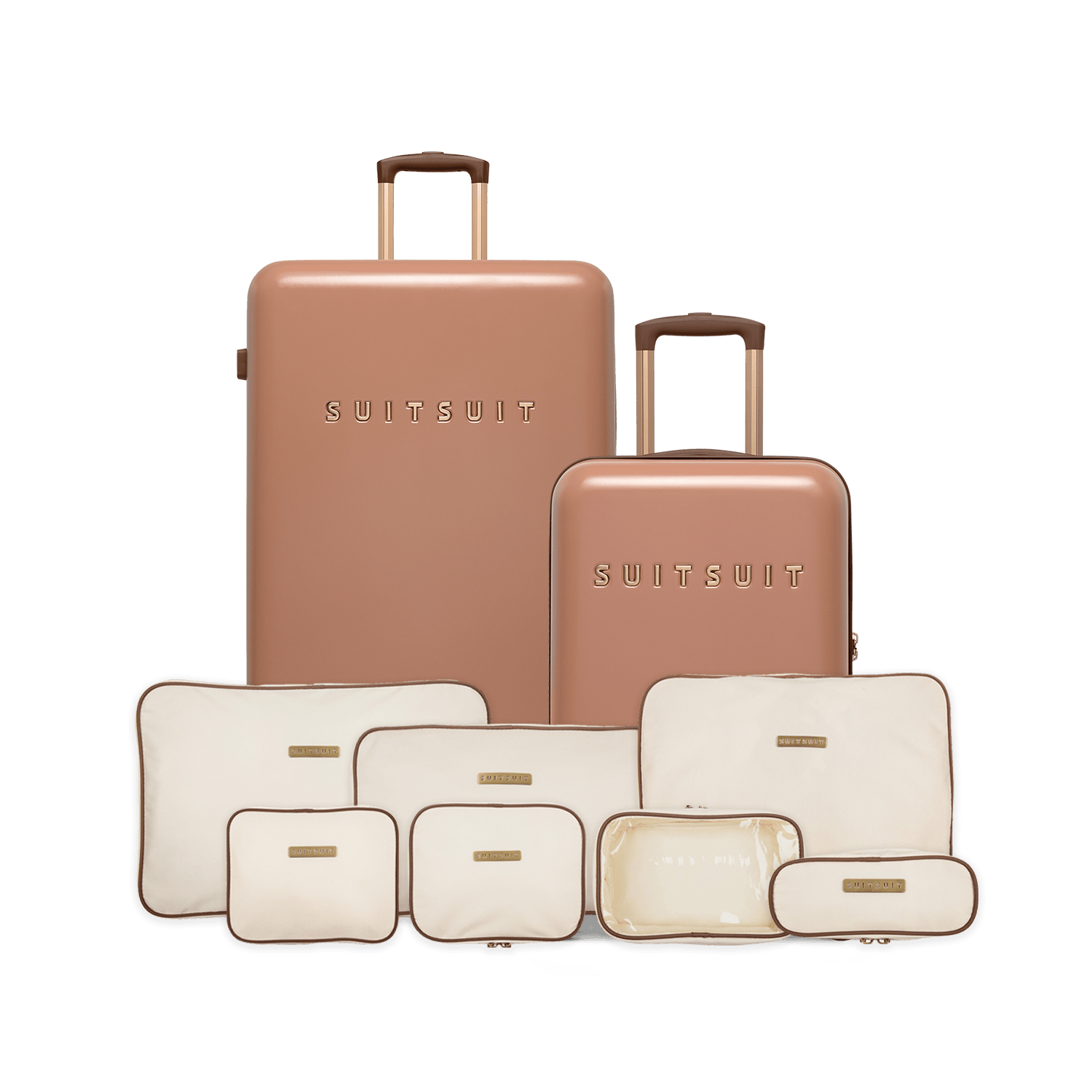 • This set includes the Italian Clay suitcase (76 CM), the Italian Clay carry-on suitcase (55 CM), and two Antique White packing cube sets (55 CM and 76 CM).