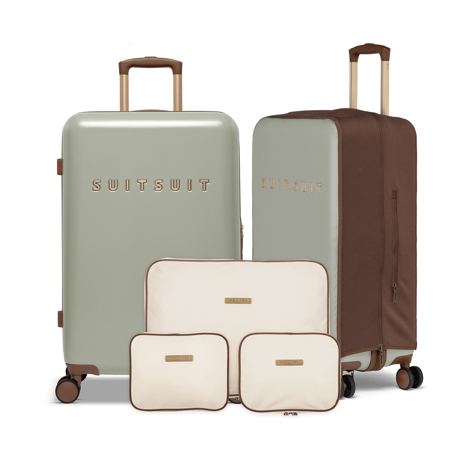 - This set contains the Sustained Grey check-in suitcase (66 CM), the Burned Caramel protection cover (66 CM) and the Antique White packing cube set (66 CM).