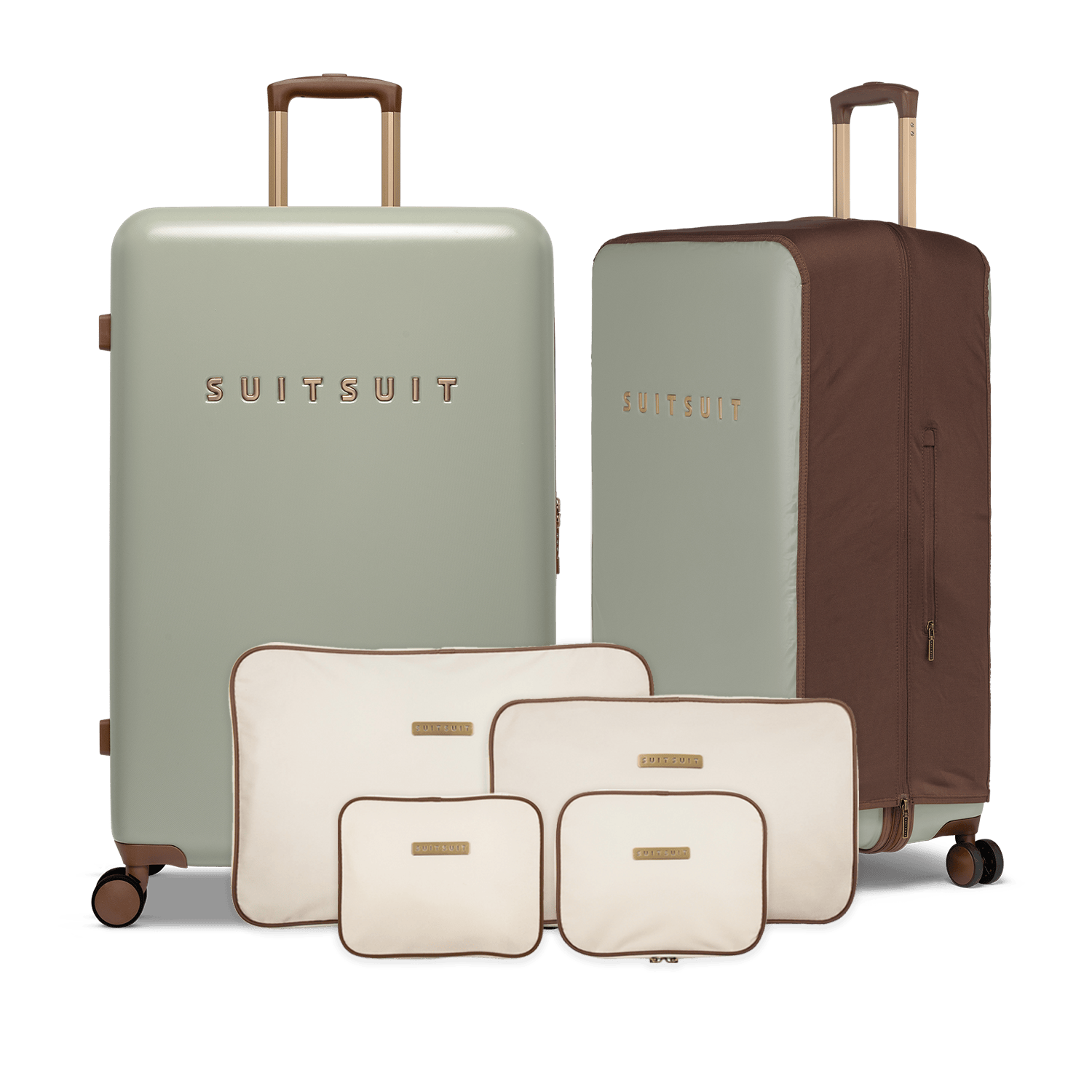 - This set contains the Sustained Grey check-in suitcase (76 CM), the Burned Caramel protection cover (76 CM) and the Antique White packing cube set (76 CM).