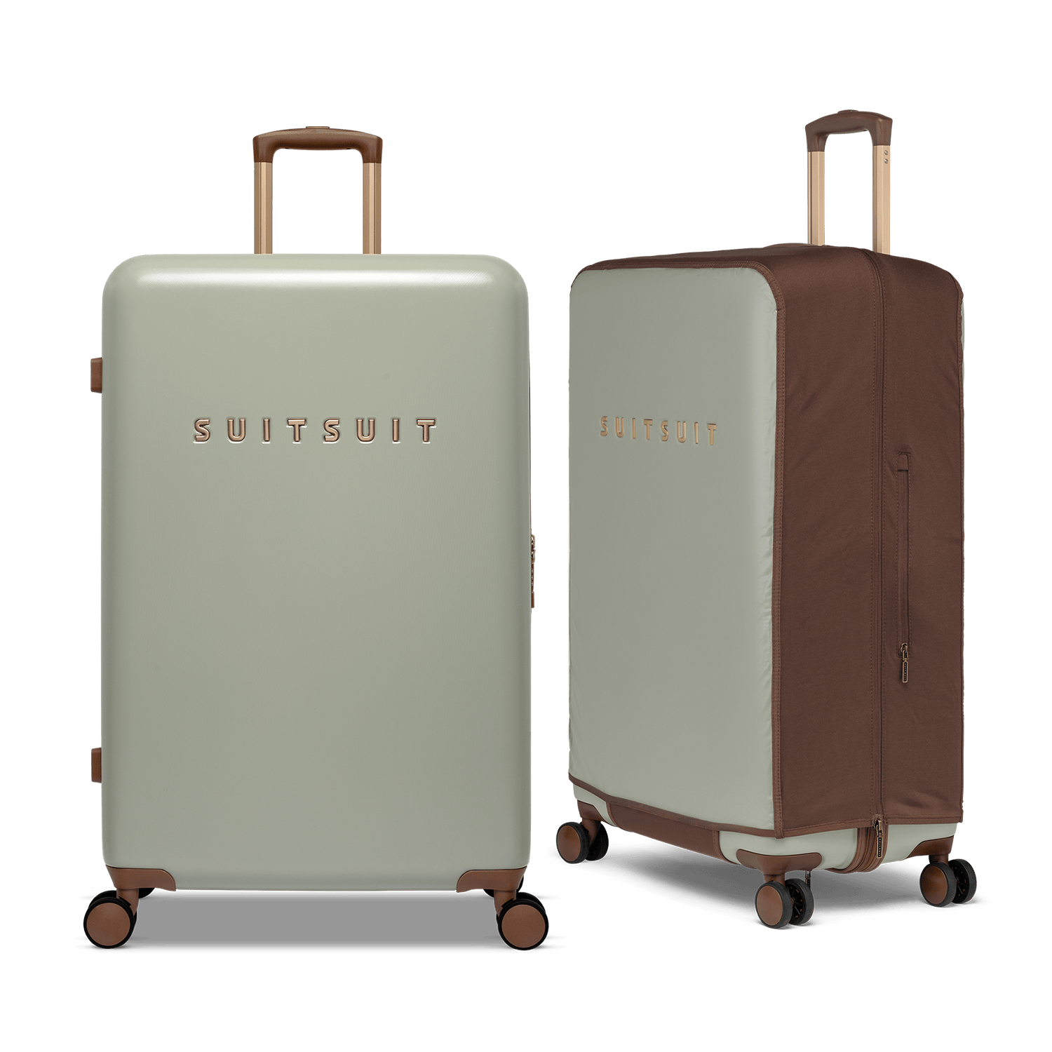 - This set contains the Sustained Grey check-in suitcase (76 CM) and the Burned Caramel protection cover (76 CM).