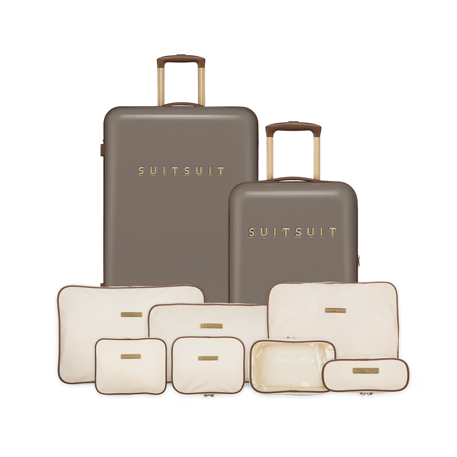 - This set includes the Taupe suitcase (76 CM), the Taupe carry-on suitcase (55 CM), and two Antique White packing cube sets (55 CM and 76 CM).