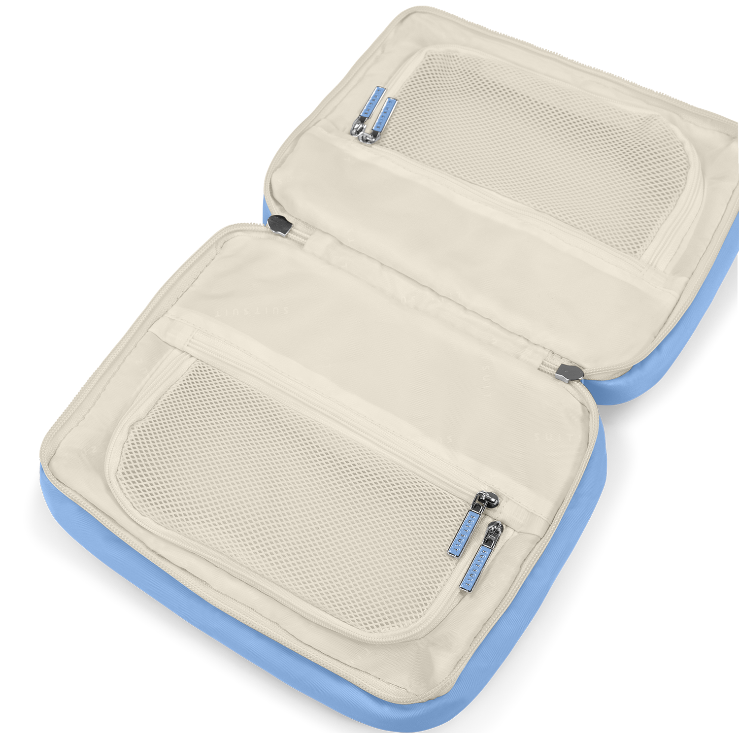 - The packing cube set includes: a clothing organiser, a small organiser, and a lingerie organiser.