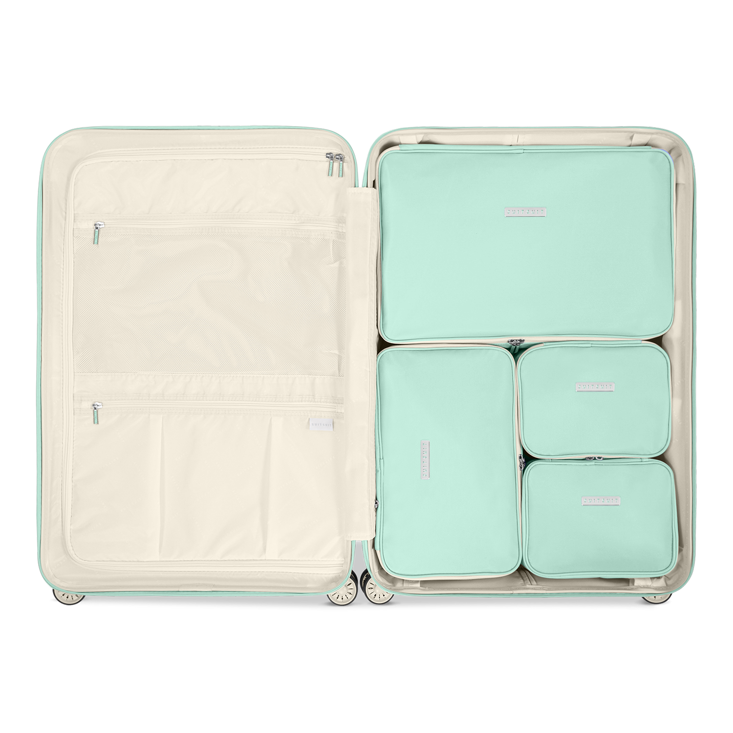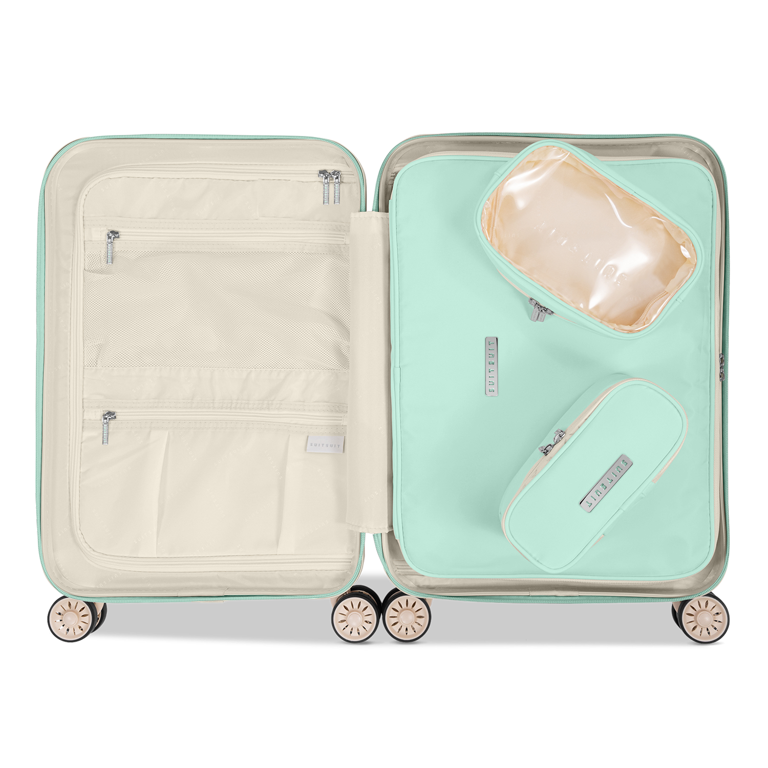 - This set includes the Luminous Mint check-in suitcase (76 CM), the Luminous Mint carry-on suitcase (55 CM), and two Luminous Mint protection covers (55 CM and 76 CM).
