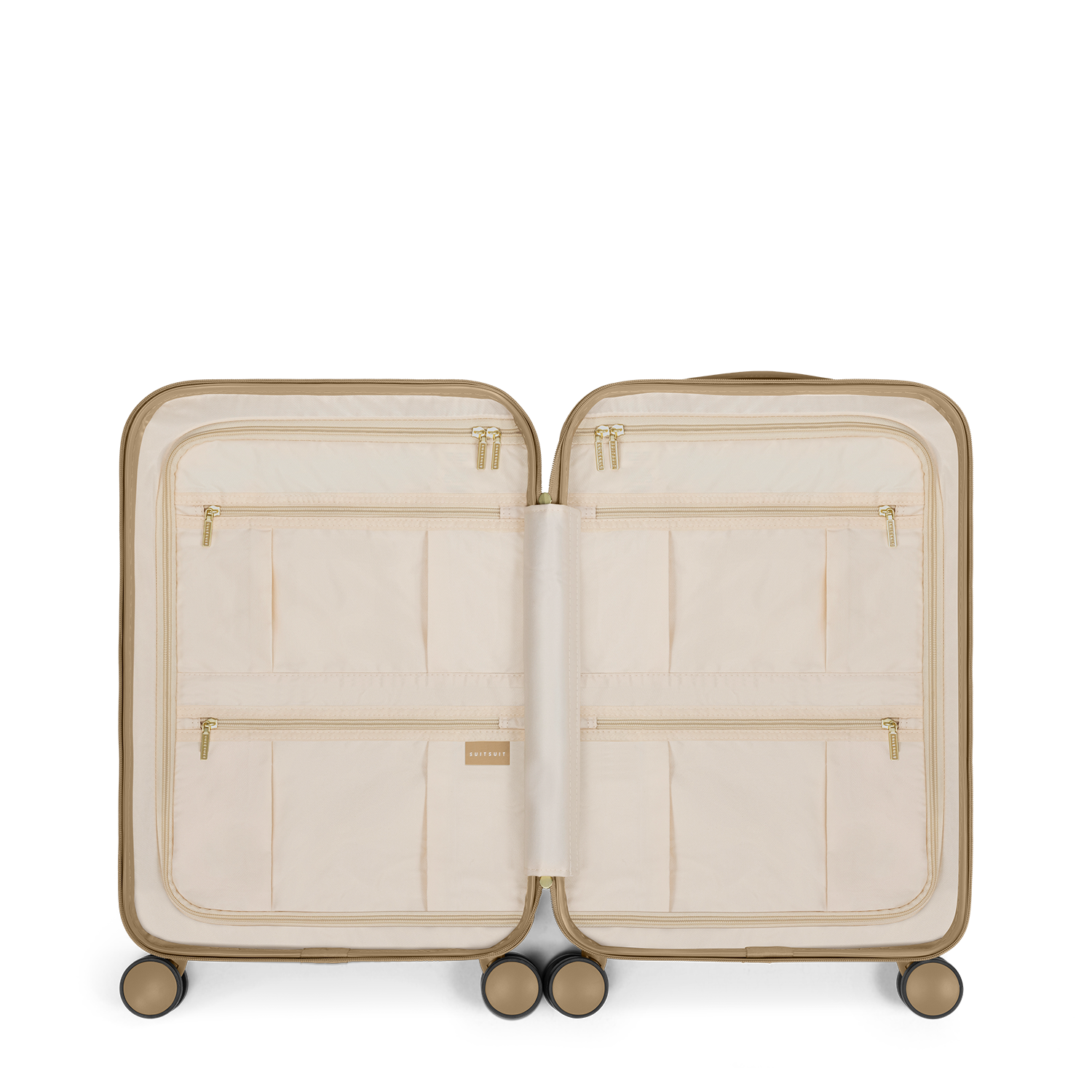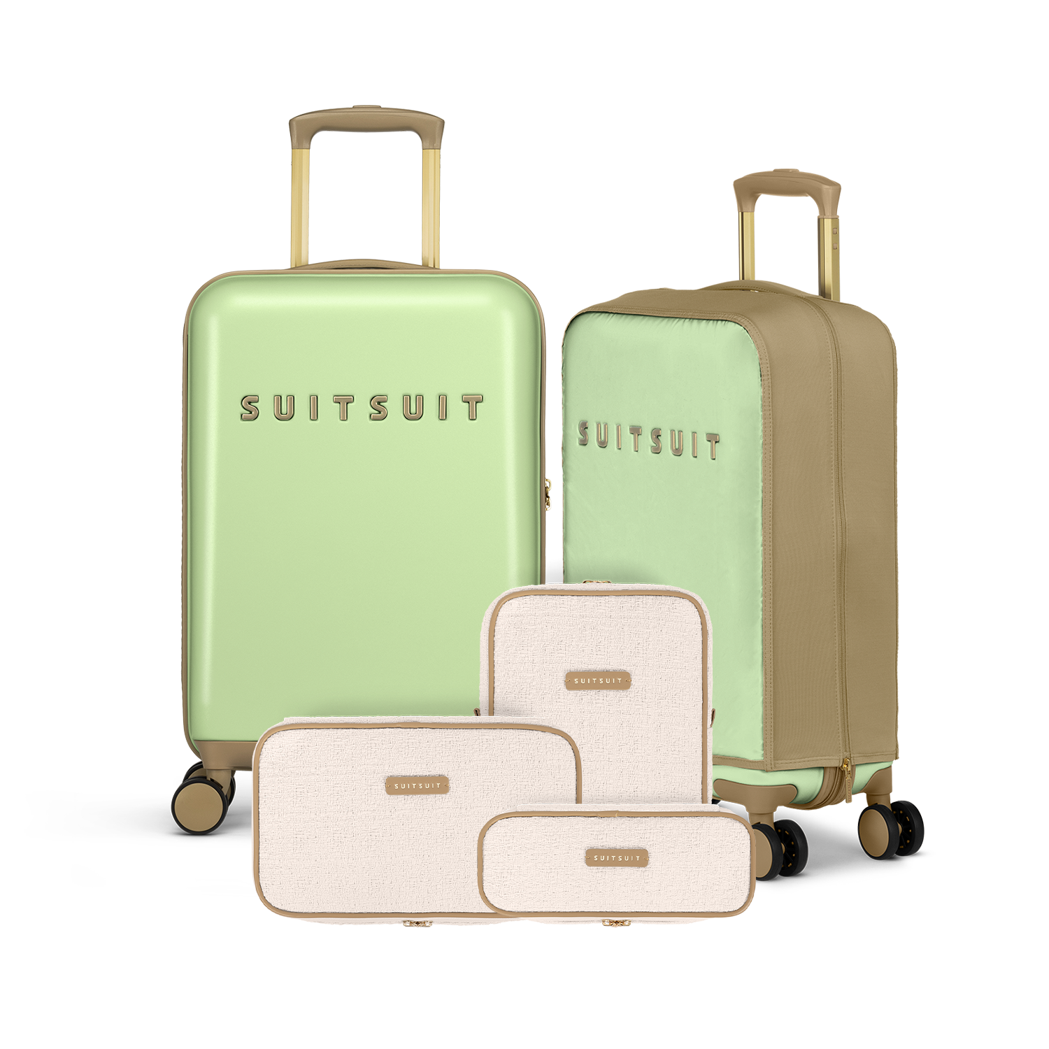 - This set includes the Butterfly Green carry-on suitcase (55 CM), the Iced Coffee protection cover (55 CM), and the Sloppy Cotton packing cube set (55 CM).