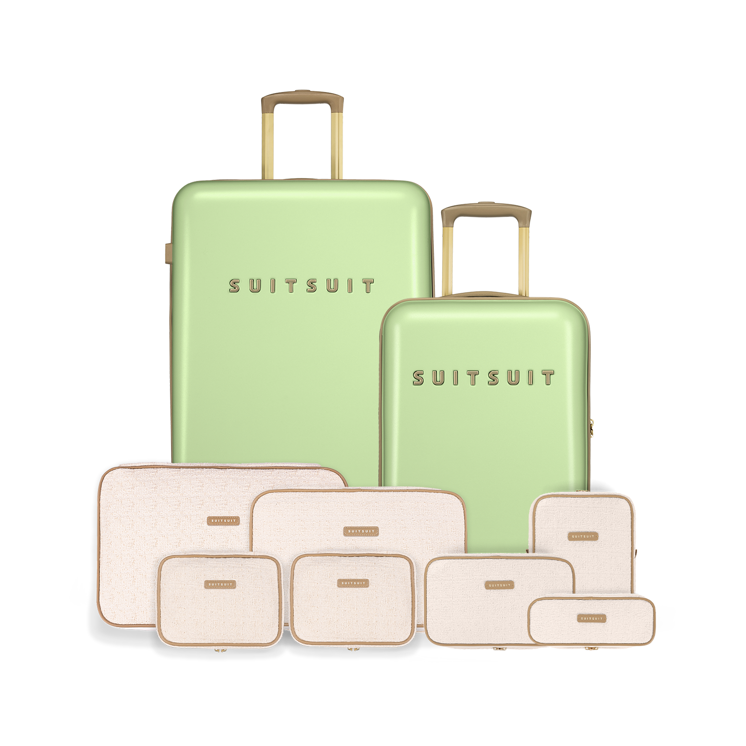 - This set includes the Butterfly Green suitcase (76 cm), the Butterfly Green carry-on suitcase (55 CM), and two Sloppy Cotton packing cube sets (55 CM and 76 CM).