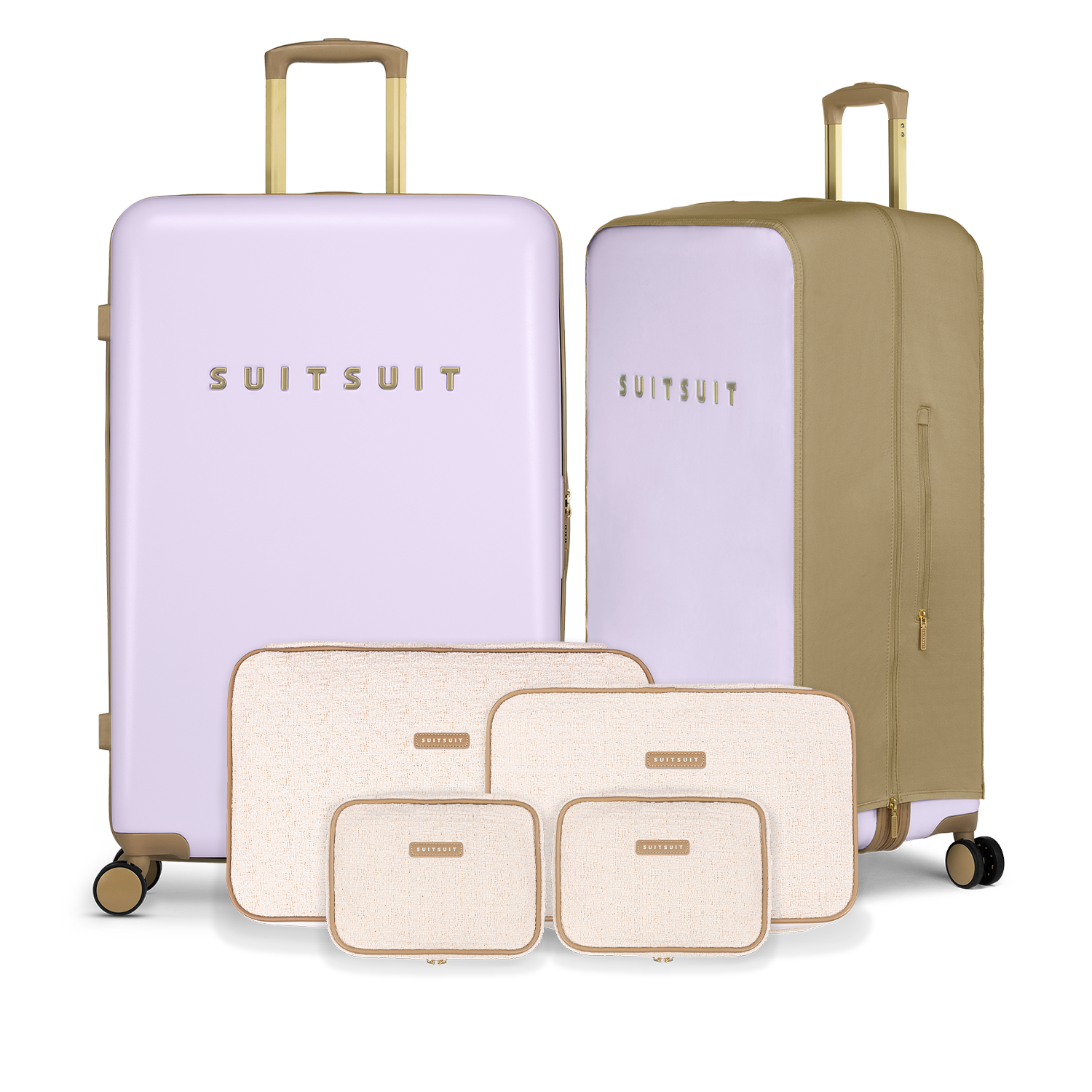 - This set includes the Orchid Bloom suitcase (76 CM), the Iced Coffee protection cover (76 CM), and the Sloppy Cotton packing cube set (76 CM).
