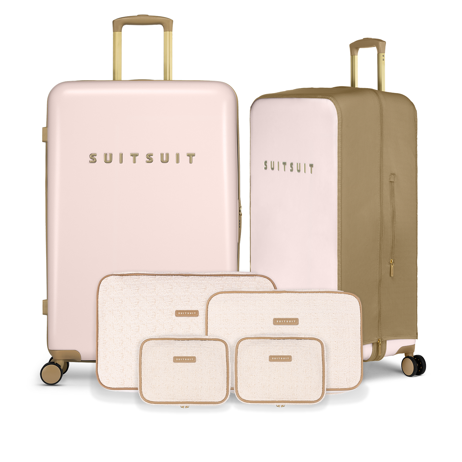 - This set includes the Rose Pearl suitcase (76 CM), the Iced Coffee protection cover (76 CM), and the Sloppy Cotton packing cube set (76 CM).