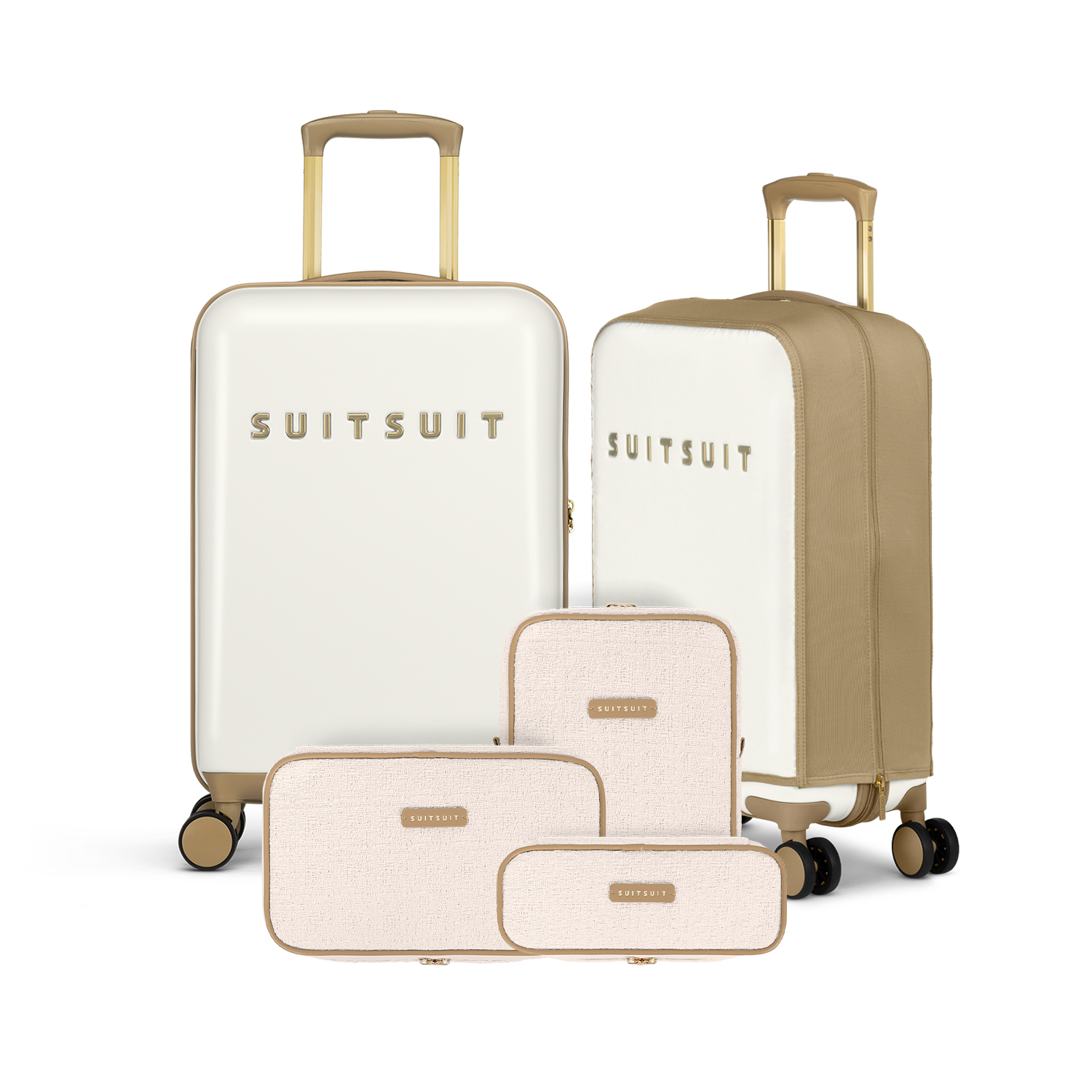 - This set includes the White Swan carry-on suitcase (55 CM), the Iced Coffee protection cover (55 CM), and the Sloppy Cotton packing cube set (55 CM).