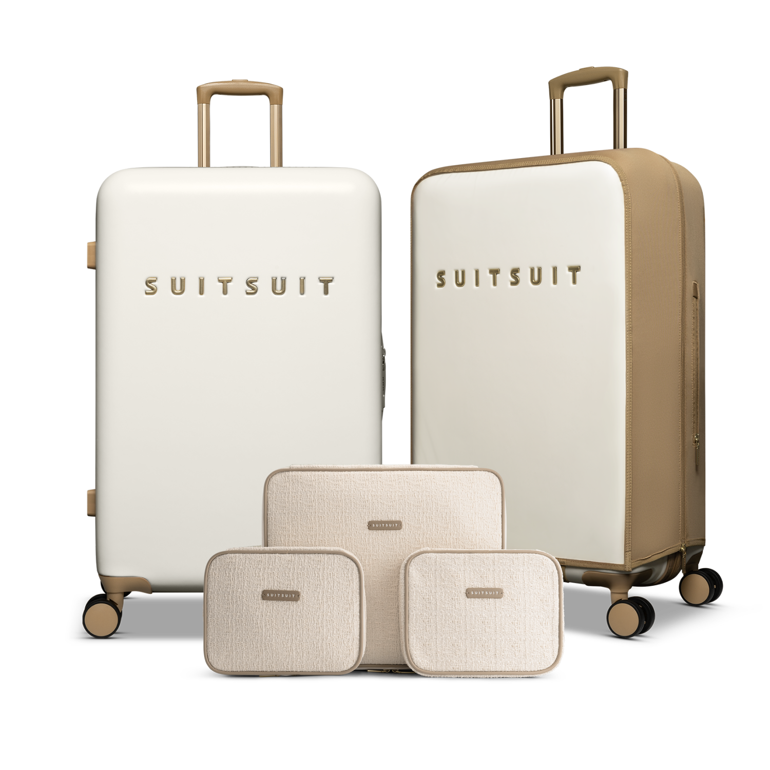 - This set includes the White Swan suitcase (66 CM), the Iced Coffee protection cover (66 CM), and the Sloppy Cotton packing cube set (66 CM).