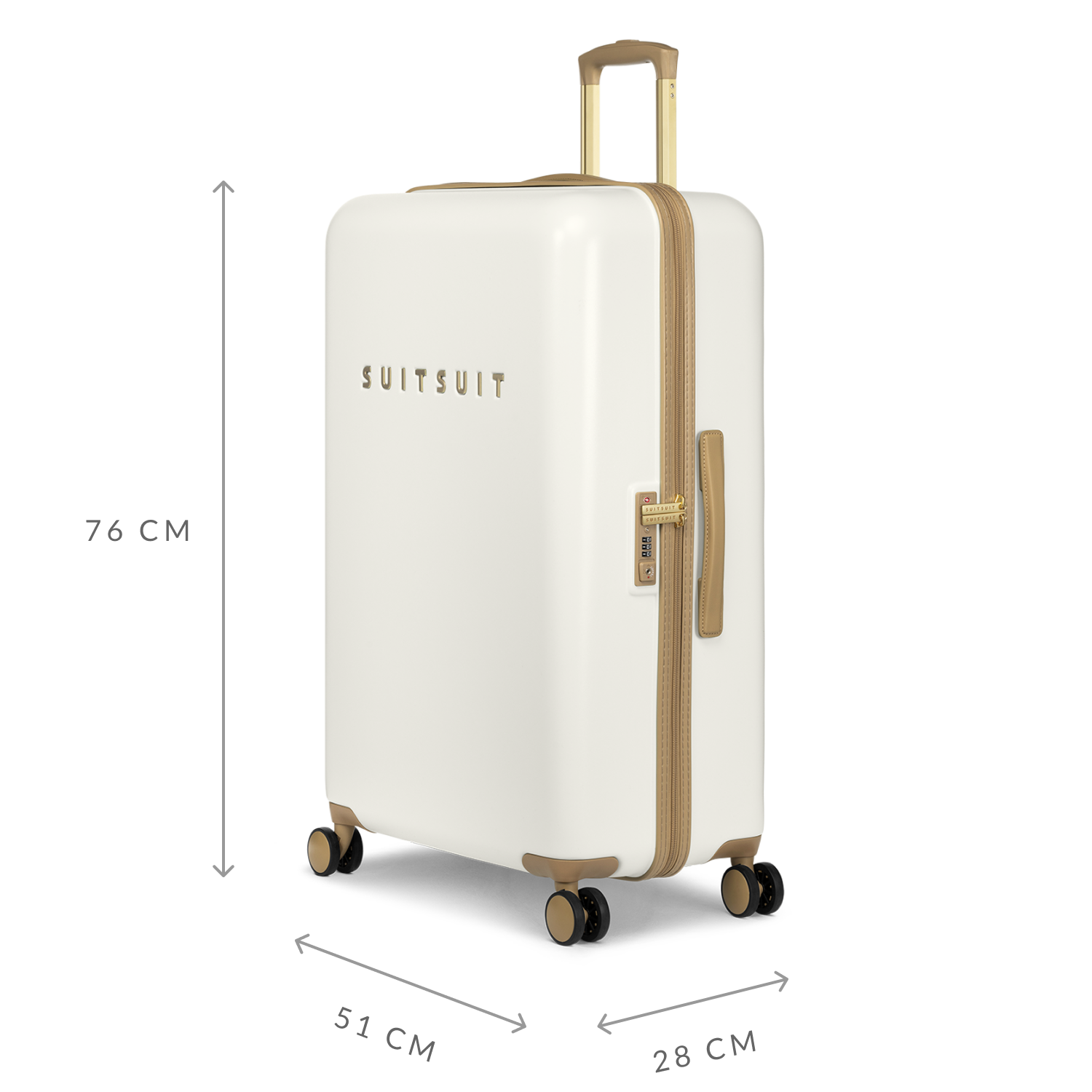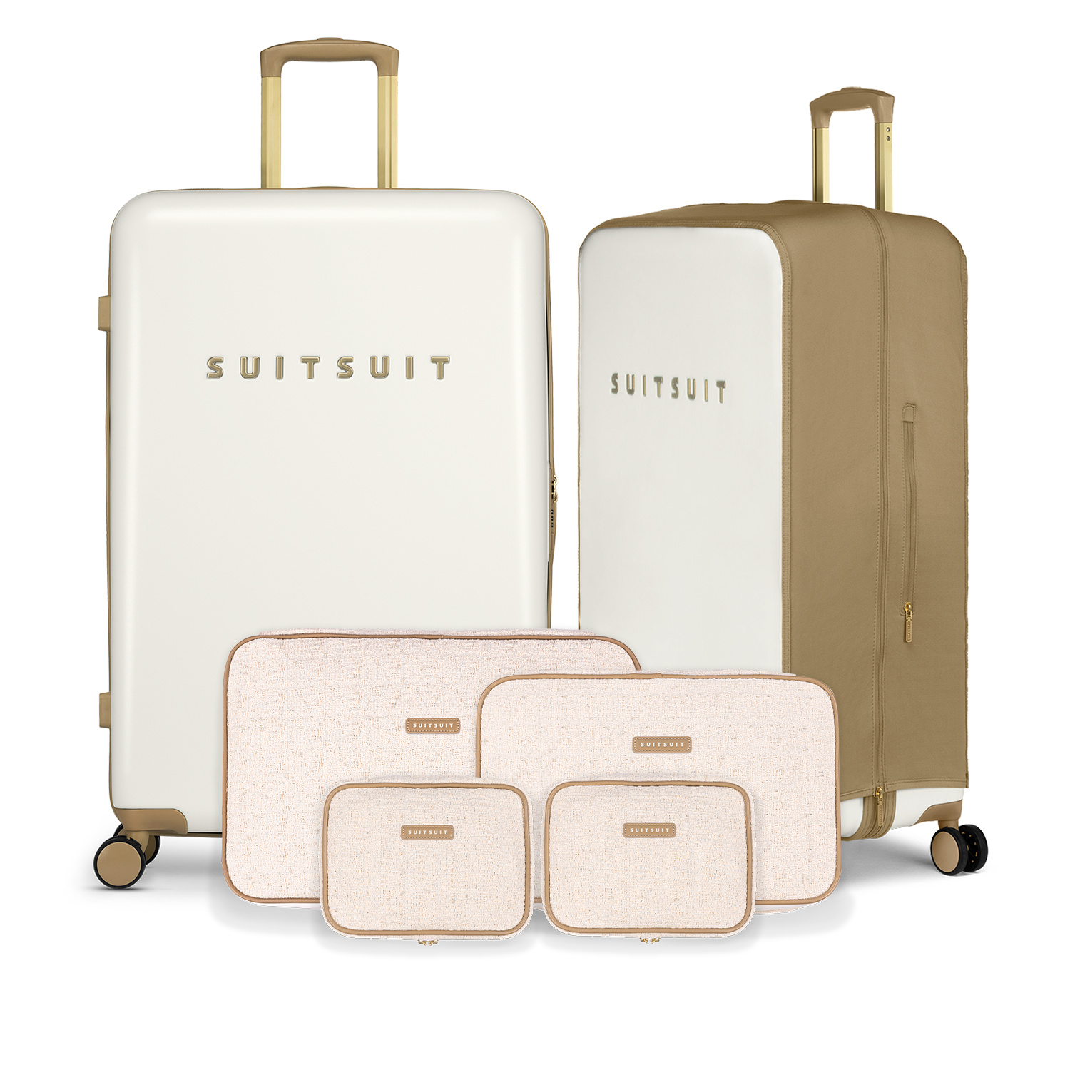 - This set includes the White Swan suitcase (76 CM), the Iced Coffee protection cover (76 CM), and the Sloppy Cotton packing cube set (76 CM).