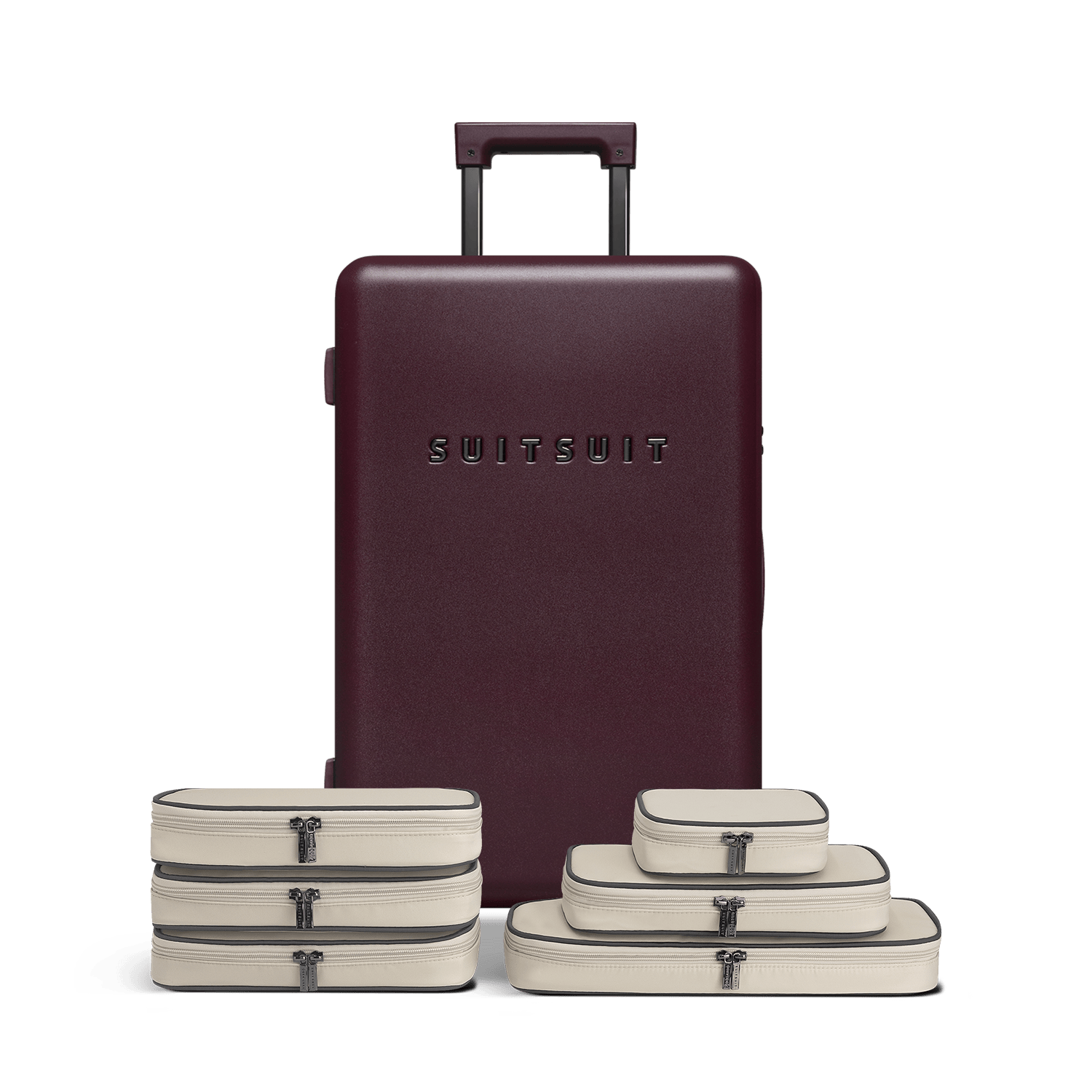 - This set contains the Cherry Lacquer check-in suitcase (66 CM) and the Faded Sand packing cube set (66 CM).