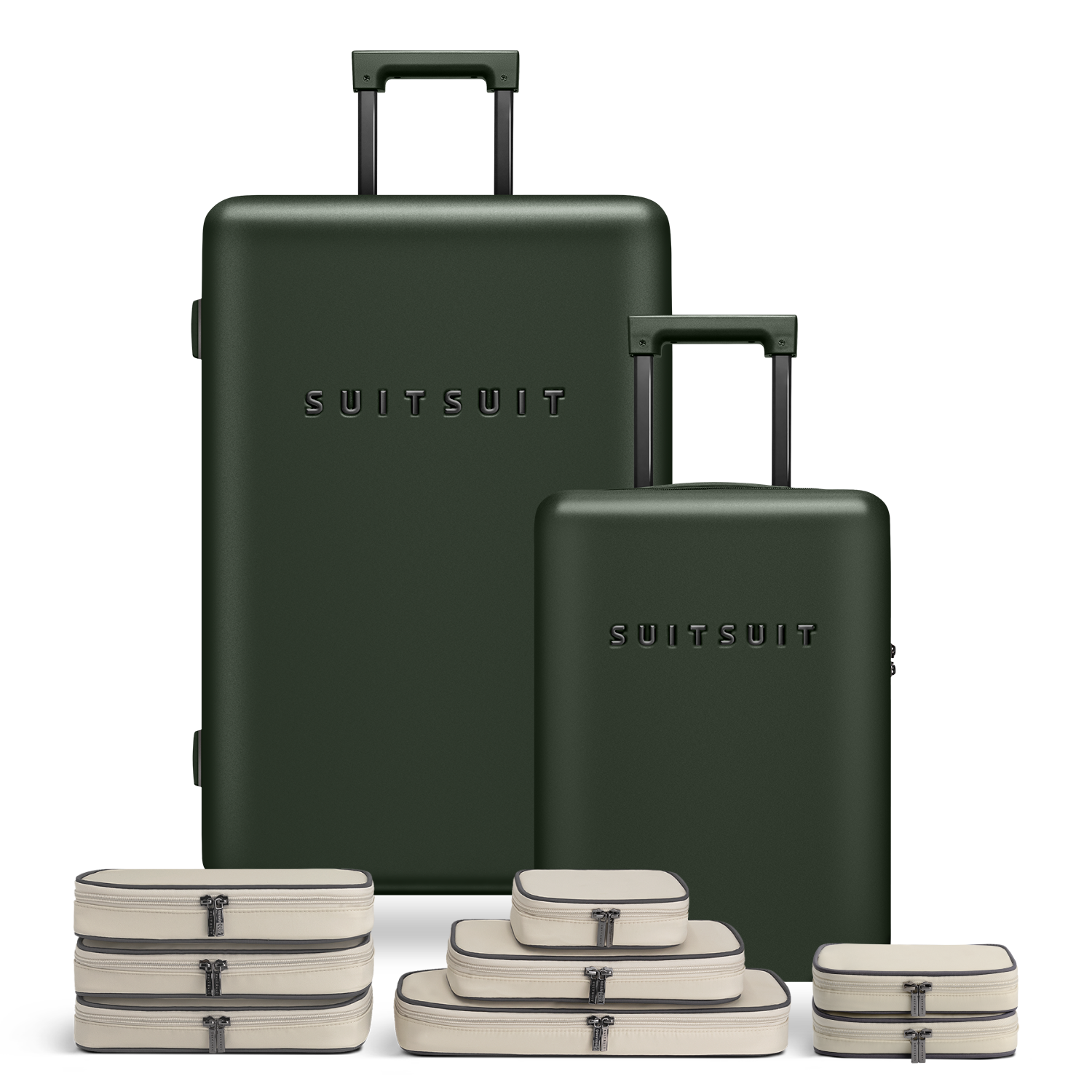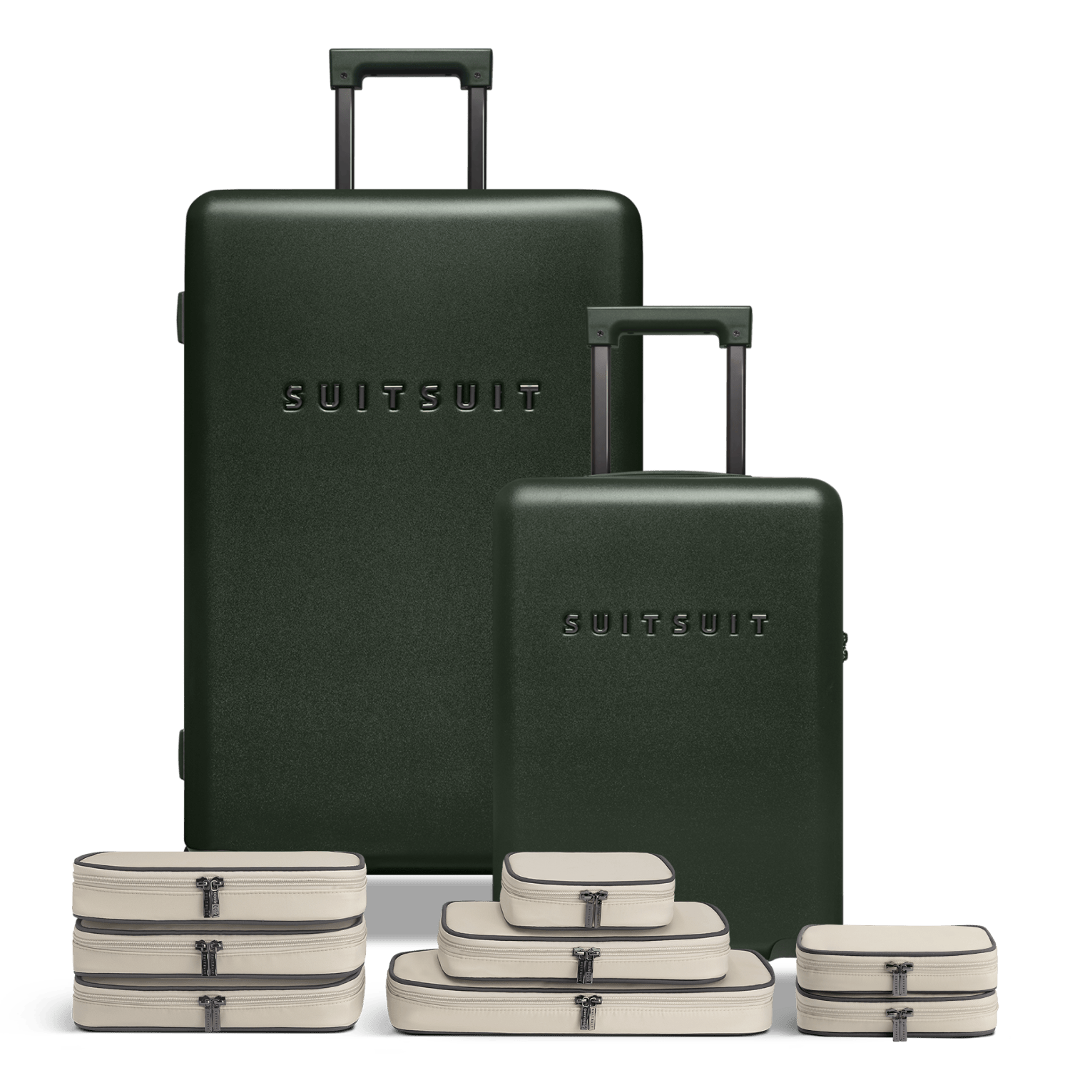 - This set includes the Dark Olive suitcase (76 CM), the Dark Olive carry-on suitcase (55 CM), and two Faded Sand packing cube sets (55 CM and 76 CM).