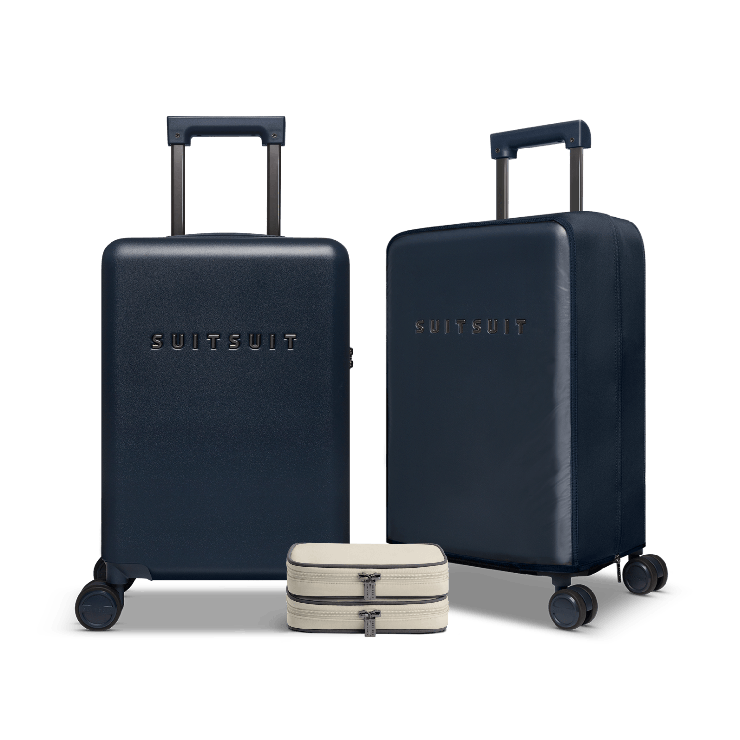 - This set contains the Midnight Blue carry-on suitcase (55 CM), the Midnight Blue protection cover (55 CM) and the Faded Sand packing cube set (55 CM).