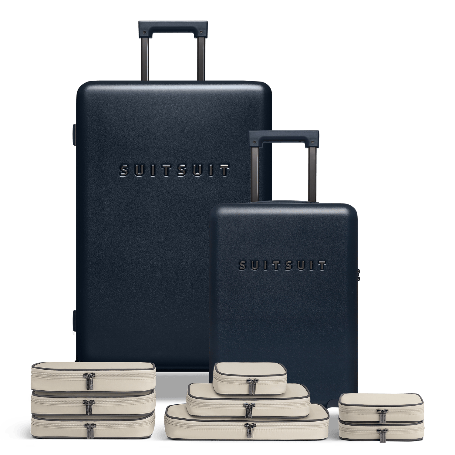 - This set includes the Midnight Blue suitcase (76 CM), the Midnight Blue carry-on suitcase (55 CM), and two Faded Sand packing cube sets (55 CM and 76 CM).