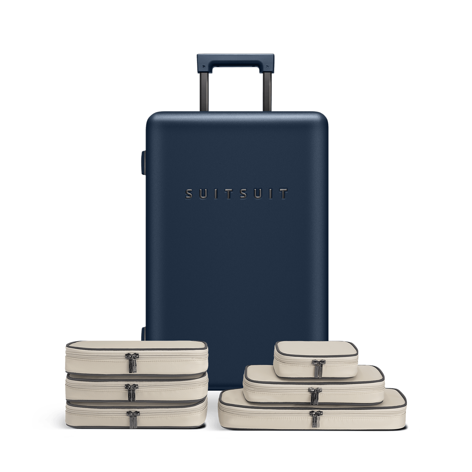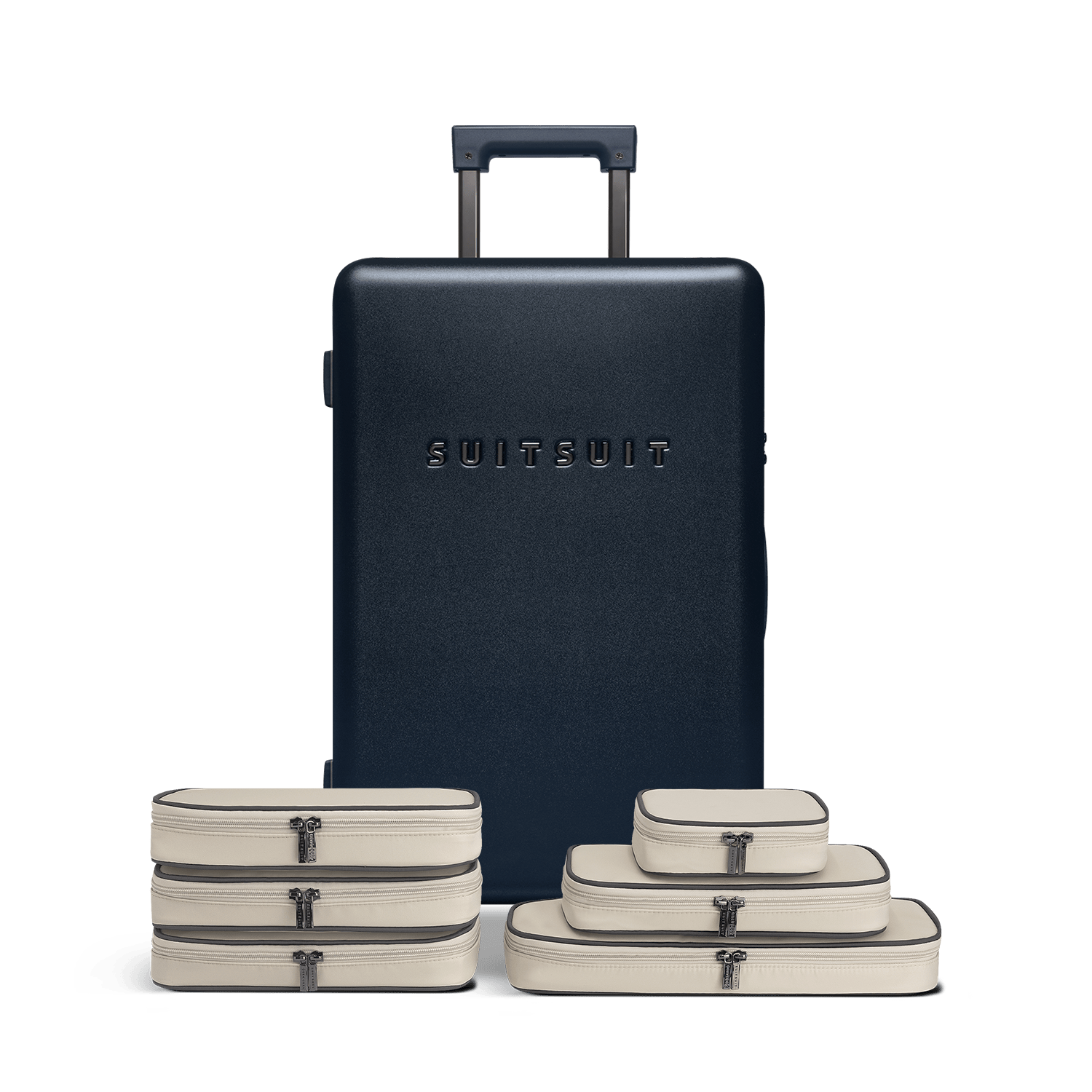 - This set contains the Midnight Blue check-in suitcase (66 CM) and the Faded Sand packing cube set (66 CM).
