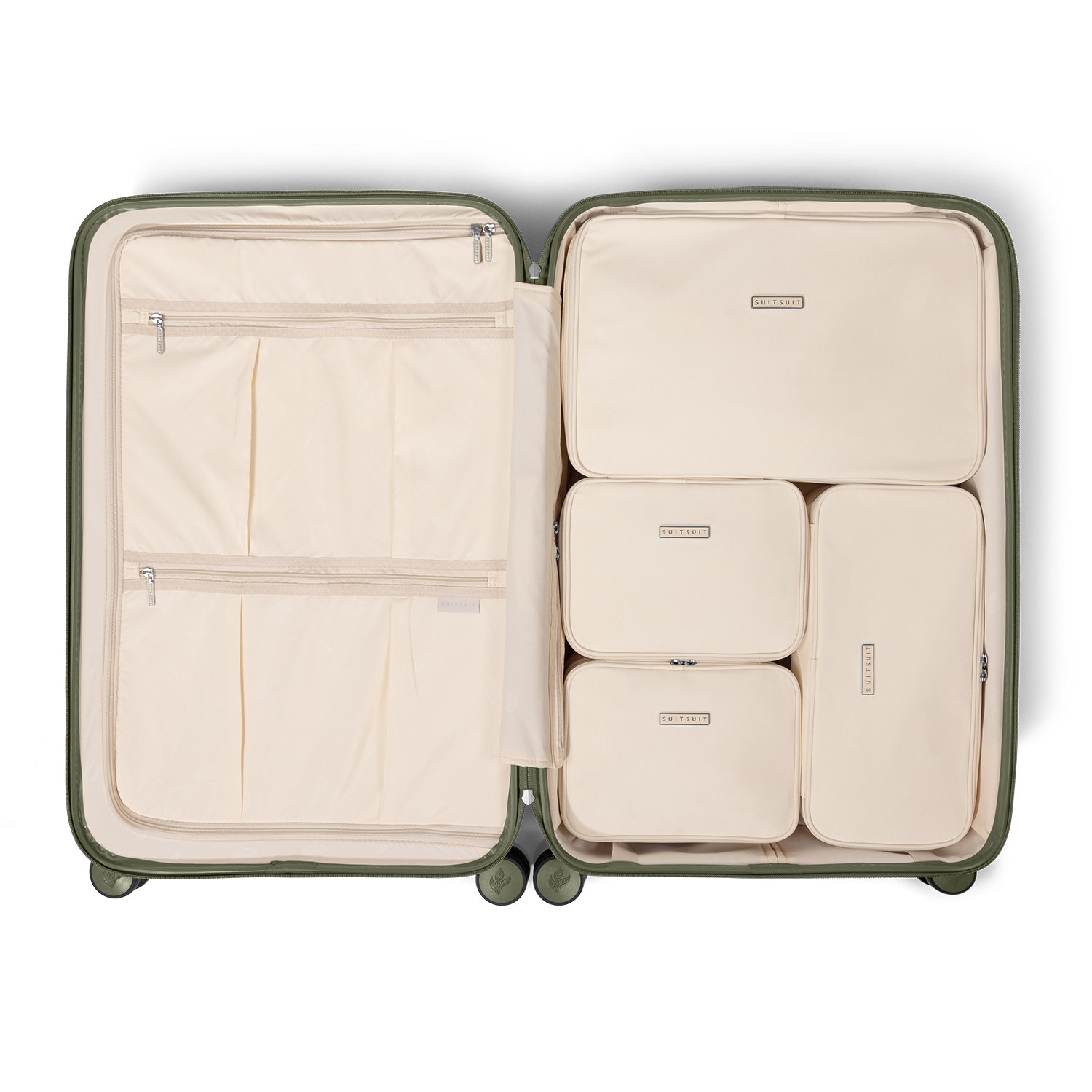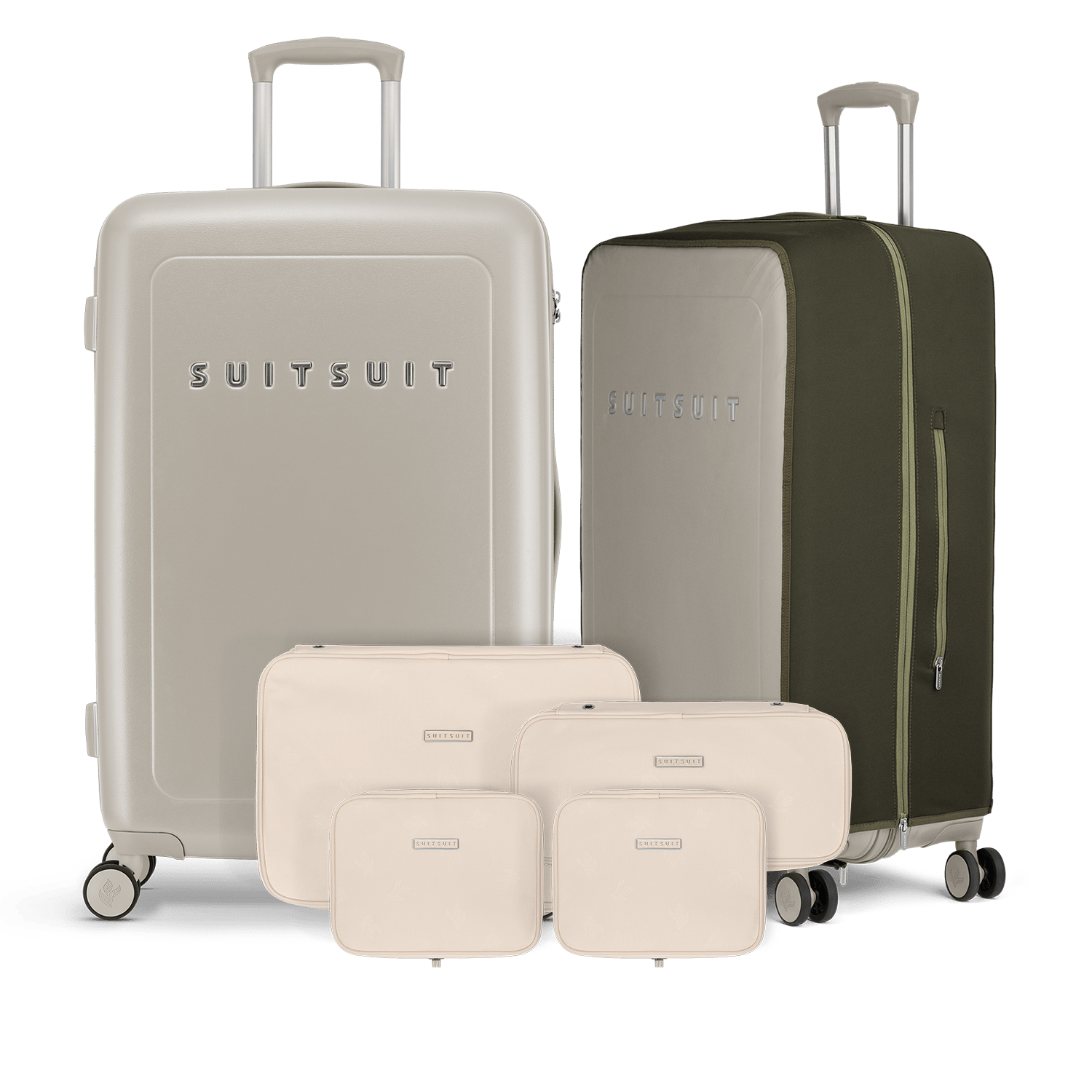 - This set contains the Bleached Sand check-in suitcase (76 CM), the Four Leaf protection cover (76 CM) and the 4-piece Macademia packing cube set (76 CM).