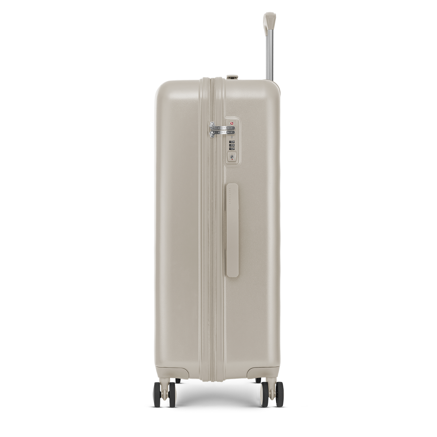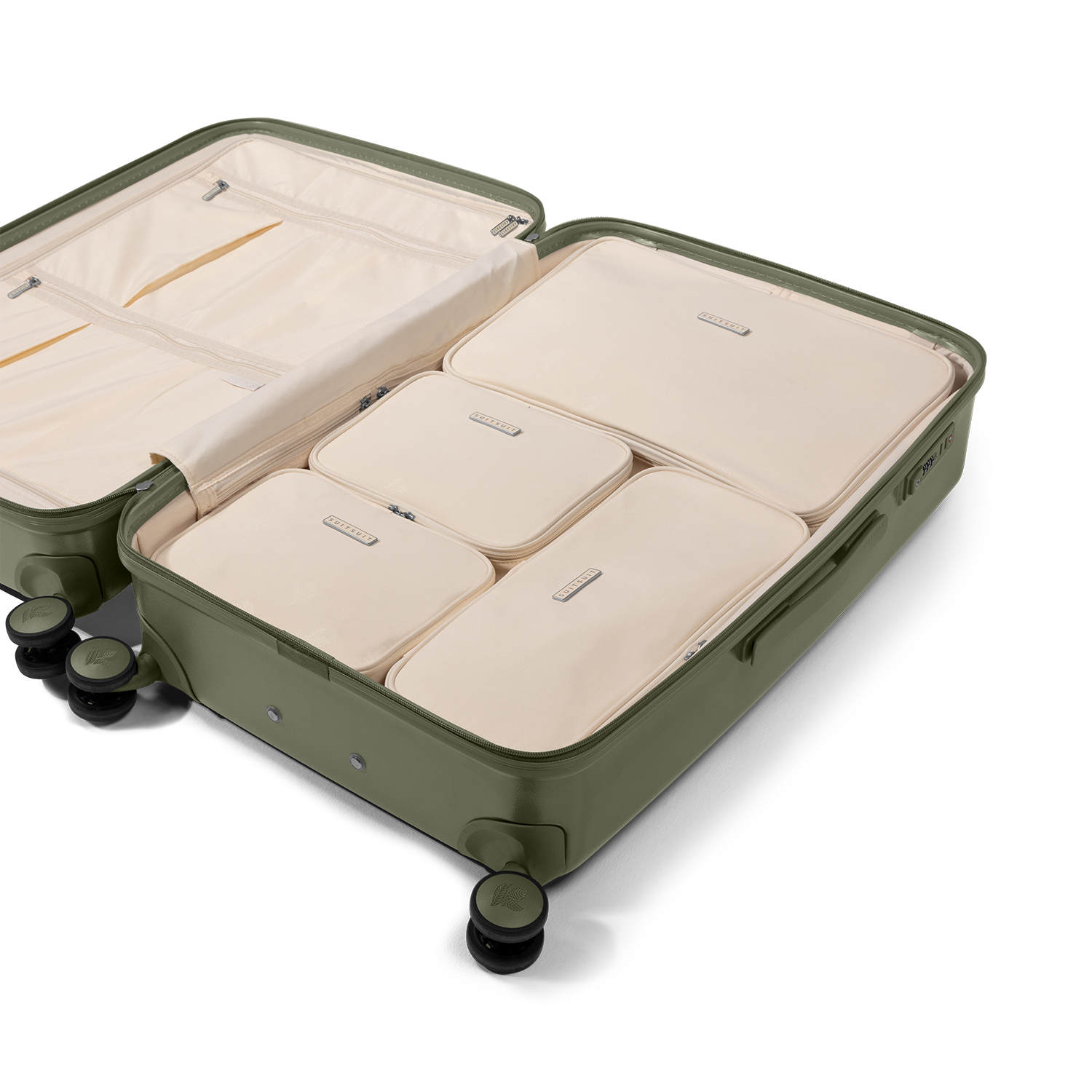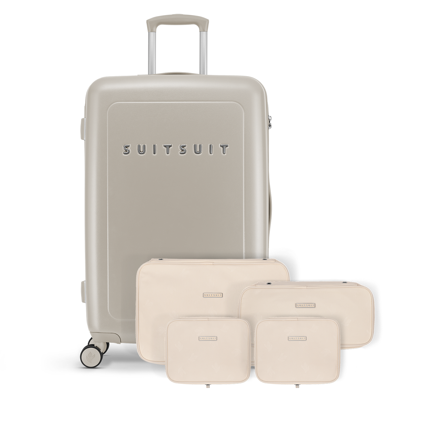 - This set contains the Bleached Sand check-in suitcase (76 CM) and the Macadamia packing cube set (76 CM).
